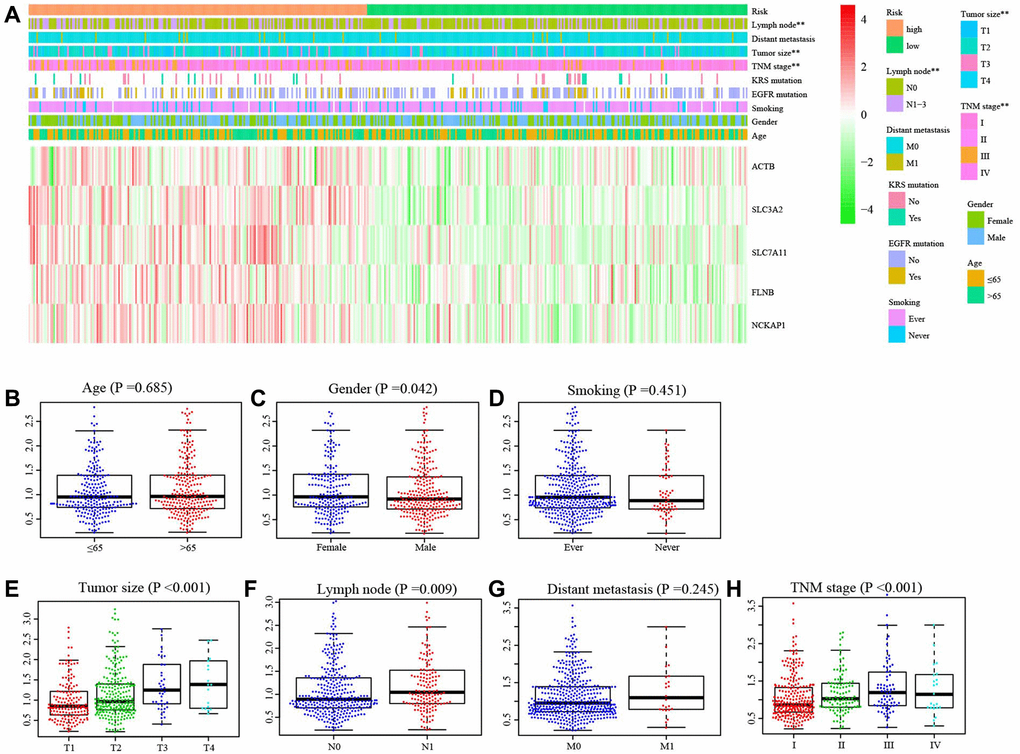 The distributions of samples with different TNM stage (P = 0.003), tumor size (P < 0.003), and lymph node metastasis (P = 0.025) were significantly diverse between different risk groups (Figure 4A). Moreover, there was a significant difference in the risk scores among patients with varying tumor sizes (P < 0.001, Figure 4E). Similar results were observed among patients with different TNM stages (Figure 4H). The risk score significantly increased in female patients (P = 0.042, Figure 4C) or with lymph node metastasis (P = 0.009, Figure 4F). However, we did not find the effect of age (Figure 4B), smoking (Figure 4D) and distant metastasis (Figure 4G) on the risk score.
