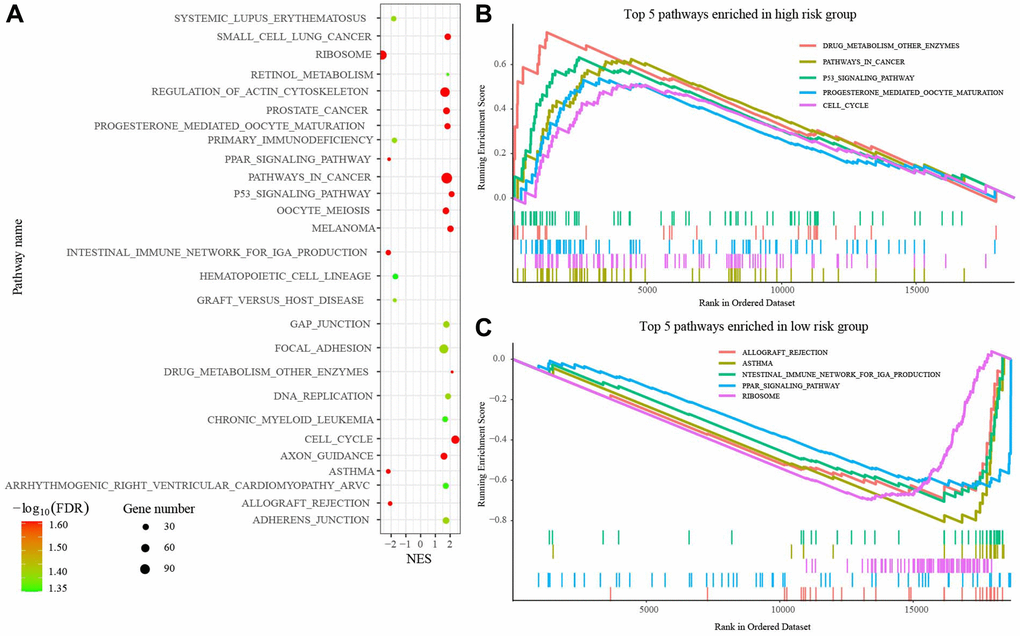 Then, we performed the GSEA to explore the altered biological roles and signaling pathways between the low- and high-risk group. A total of 27 pathways were enriched, including Pathways in cancer, P53 signaling pathway, and so on, that were highly associated with tumorigenesis and development (Figure 6A). Figure 6B, 6C presented the top 5 pathways enriched in high- and low-risk groups.