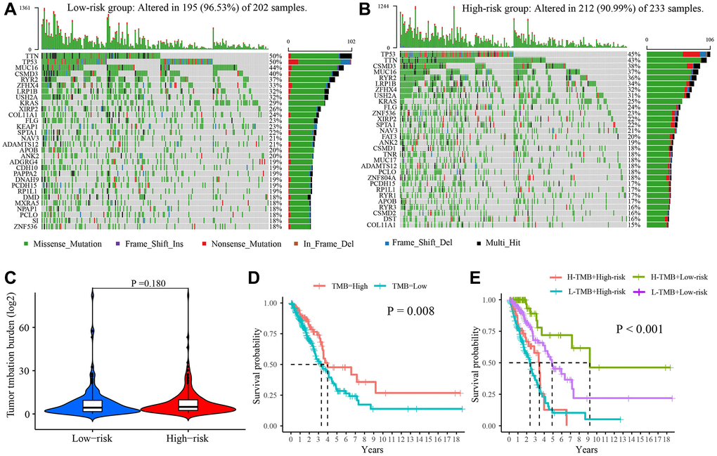 The mutational landscape showed that the frequent mutation events in the low-risk group (96.53%) were more than that in the high-risk group (90.99%) (Figure 7A, 7B). In the high-risk group, the most frequently mutated gene was TTN (50%), followed by TP53 (50%) and MUC56 (44%). In the low-risk group, the top 3 frequently mutated genes were TP53 (45%), TTN (43%), and CSMD3 (38%). However, there was no difference in TMB between the two risk groups (P = 0.180, Figure 7C). Survival analysis revealed that high TMB had a better prognosis in LUAD patients (P = 0.008, Figure 7D). Furthermore, it could better predict prognosis when combining the TMB and the risk score (Figure 7E).