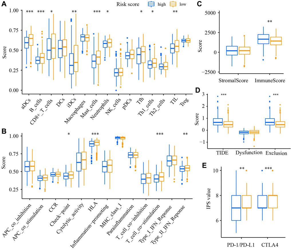 The R package: GSVA (3.1.7) was applied to carry out the ssGSEA reflecting the level of TIICs and the activity of immune-related functions. The R package: “ESTIMATE” (1.0.13) was used to calculate the immune and stromal score in the tumor microenvironment. The immunophenoscore (IPS) value of samples was gathered from The Cancer Immunome Atlas (TCIA, https://tcia.at) to present the response to immune checkpoint inhibitors treatment [20]. The TIDE score was collected from Tumor Immune Dysfunction and Exclusion (TIDE, http://tide.dfci.harvard.edu). The higher TIDE score represents the worse response to immune therapy.
