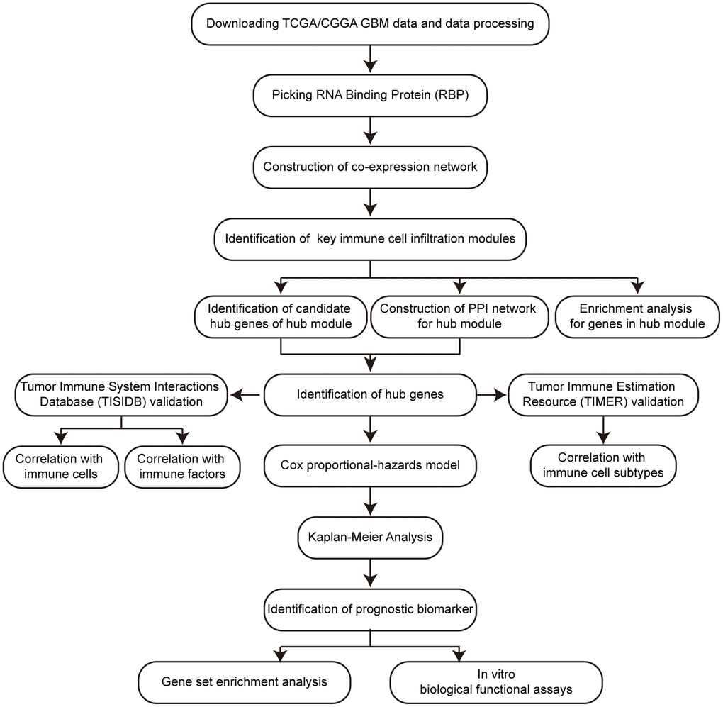 GBM is the most malignant primary tumor in the adult central nervous system. Although there are many significant research breakthroughs in the immunotherapy of GBM, it has not yet been effective enough in clinical GBM treatment applications. RBPs play crucial roles in GBM progression, but little is known about their association with immune infiltration and key genes in GBM progression.