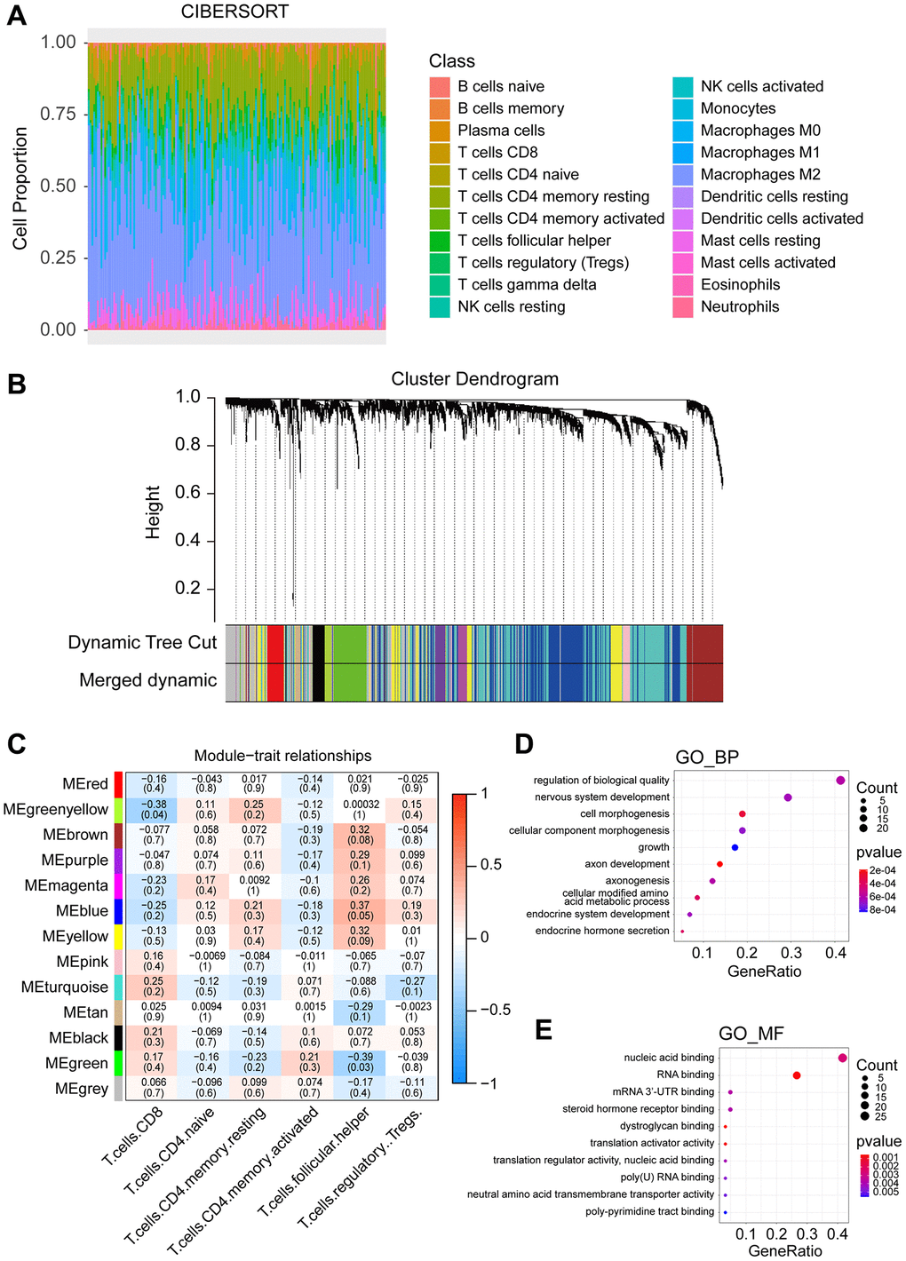 Using soft threshold = 4 (scale-free R2 = 0.85) (Supplementary Figure 1A), a coexpression network was constructed based on the 3563 RBP genes and thirteen modules were identified (Figure 2B). The previously calculated immune infiltration proportions of seven types of T cells were selected as trait data for WGCNA, and the clustering dendrogram of the 164 IDH-wild-types GBM samples was shown in Supplementary Figure 1B.