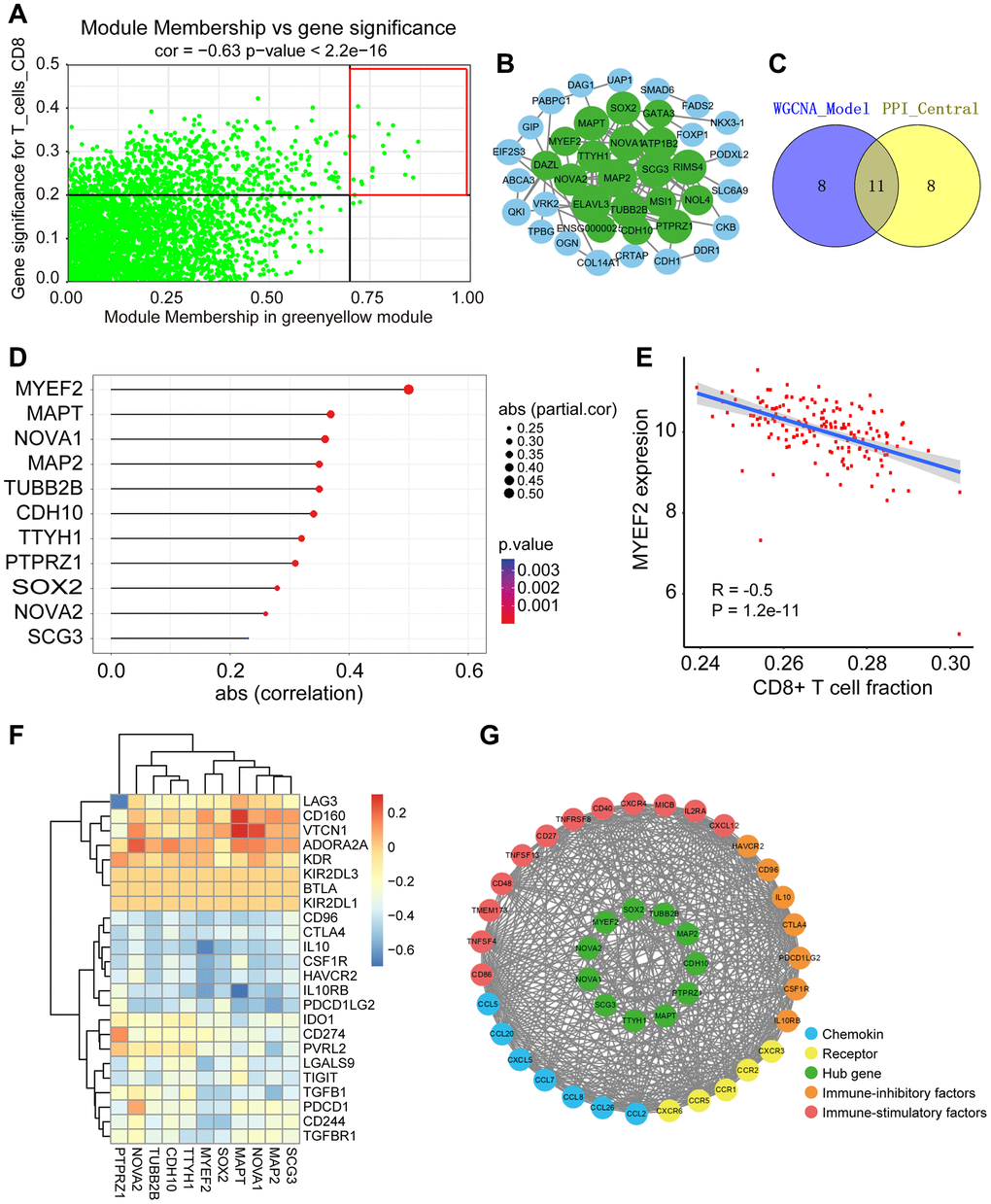 Next, we analyzed the correlations between expression of hub gene and immune factors in the TISIDB database, including immune-inhibitory factors, immune-stimulatory factors, chemokines and receptors (Supplementary Figure 3B–3D). Specifically, we observed a negative correlation between MYEF2 expression and several immune-inhibitory factors, including LAG3, PDCD1, PDCD1LG2, CTLA4, TIGIT and HAVCR2, which were characteristics of dysfunctional CD8+ T cells (Figure 3F). Utilizing an average absolute Spearman correlation coefficient greater than 0.35, we identified 33 immune-related factors that exhibited strong associations with the 11 hub genes. Based on these 33 immune-related factors and the 11 hub genes, an immune infiltration interaction network was constructed using STRING and visualized through Cytoscape (Figure 3G). Among these 33 immune-related factors, HAVCR2, CTLA4 and PDCD1LG2 were also found to be highly correlated with the 11 hub genes including MYEF2.