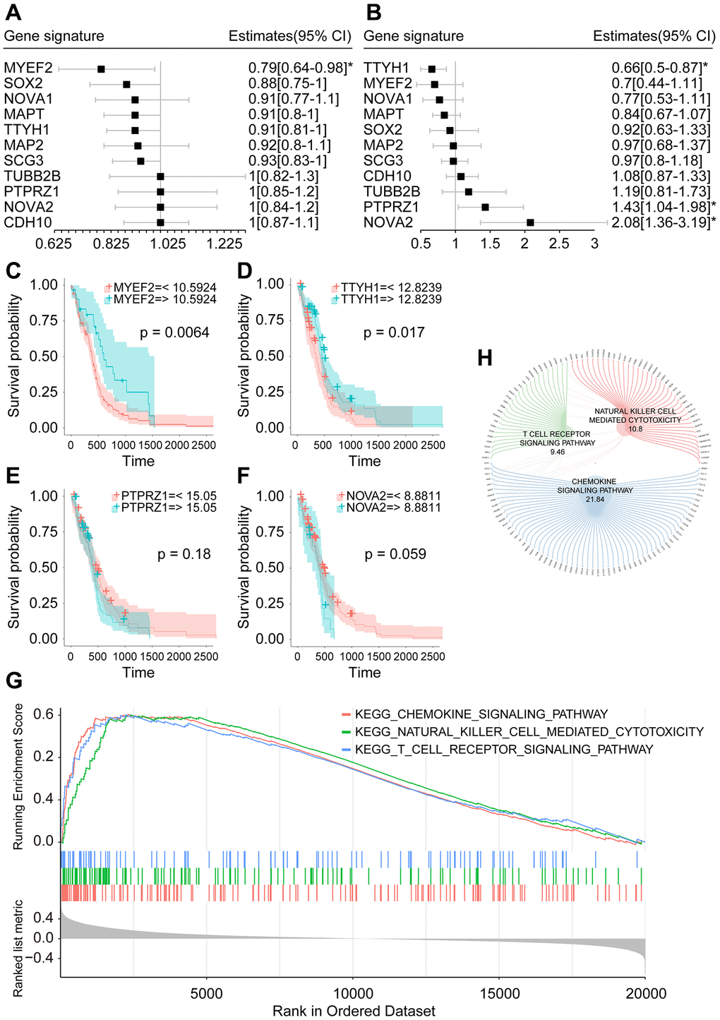 Through univariate Cox model, we found that only MYEF2 was correlated with patient prognosis (HR = 0.79, P < 0.05) (Figure 4A). However, multivariate Cox analysis showed that three genes, TTYH1 (HR = 0.66, P < 0.05), PTPRZ1 (HR = 1.43, P < 0.05) and NOVA2 (HR = 2.08, P < 0.05), were associated with patient prognosis (Figure 4B). We analyzed these genes by Kaplan–Meier analysis and found that patients with higher MYEF2 expression exhibited better survival outcomes (P = 0.0064) (Figure 4C); likewise, those with higher TTYH1 expression exhibited better survival outcomes (P = 0.017) (Figure 4D). However, the expression levels of PTPRZ1 and NOVA2 were not correlated with the survival outcomes of patients (Figure 4E and 4F). Since MYEF2 showed the highest correlation coefficient with CD8+ T cells, as shown in Figure 3D, 3E, we selected MYEF2 as a candidate prognostic biomarker for further analysis.