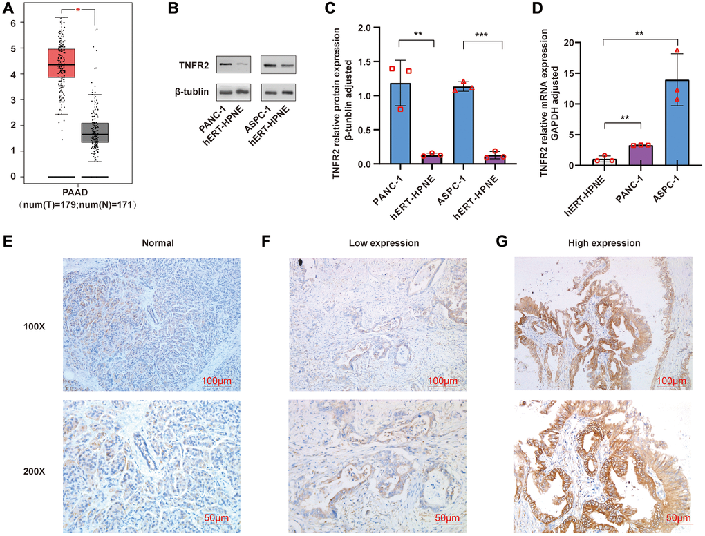 TNFR2 gene is more abundant in pancreatic cancer tissues than normal ones. IHC revealed that TNFR2 protein was highly expressed in 33 of 70 paraffin specimens; however, it was barely expressed in normal pancreatic tissues. Western blotting and qRT-PCR revealed that TNFR2 was overexpressed in pancreatic cancer cells, which were compatible with the results of GEPIA and IHC in PDACs. In summary, TNFR2 is overexpressed in pancreatic tumors and may be essential in developing pancreatic cancer.