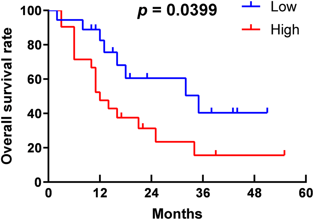 As shown in Table 2, in the high-expression group, 23 of 37 specimens (62.2%) had large tumor size, which was more than 12 of 33 specimens (36.4%) in the low-expression group, and the difference was statistically significant (p = 0.031). Sixteen patients (43.2%) in the high-expression group had lymph node metastasis, which was much more than five patients (15.2%) in the low-expression group (p = 0.01); 23 of 37 cases (62.2%) in the high-expression group had a low differentiation degree, more than eight of 33 cases (24.2%) in the low-expression group (p = 0.001). These findings suggest that high-expression of TNFR2 is positively related to large tumor size, lymph node metastasis, and low differentiation degree. Otherwise, the results indicated no significant difference in age, gender, location, or distant metastasis between the groups. PDAC patients are usually asymptomatic in the early stage, which delays early diagnosis, resulting in metastasis and loss of the opportunity to undergo surgery. Therefore, only nine patients had distant metastasis in our cohort, and the small sample size may influence the statistical difference between the two groups. Furthermore, we followed pancreatic cancer patients who underwent surgery. Survival was displayed in Kaplan-Meier curves (Figure 2). Patients in the high-expression group had poorer outcomes than those in the low-expression group (p = 0.0399). This finding indicated that high-expression of TNFR2 is positively associated with poor outcomes in PDAC. Overall, we demonstrate that high-expression of TNFR2 is related to aggressive clinicopathologic characteristics and poorer prognosis.
