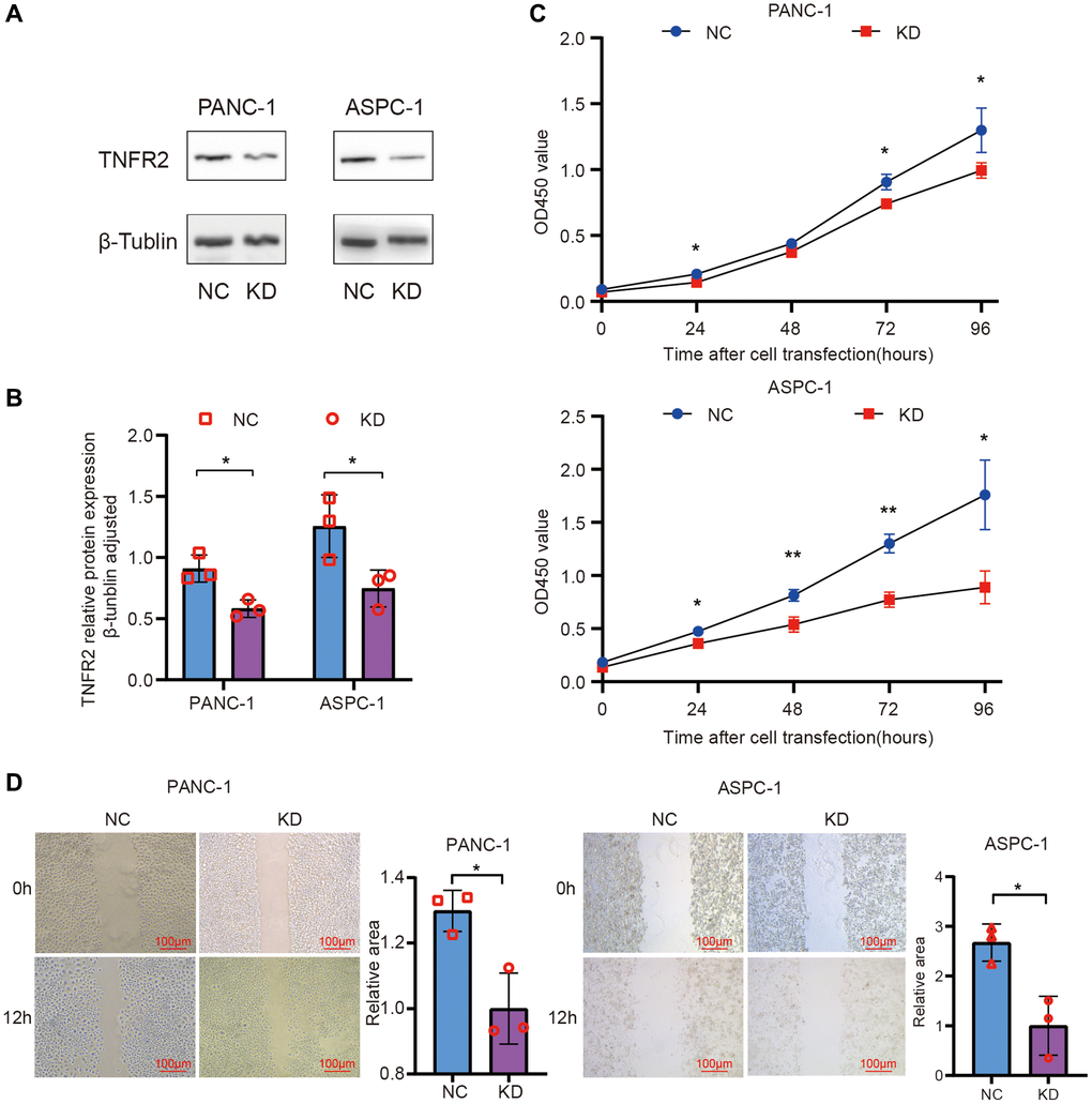 We knocked down TNFR2 in PANC-1 and ASPC-1 cell lines using siRNA transfection. NC siRNA and TNFR2-siRNA sequences were transfected into PANC-1 and ASPC-1 cells. The PDAC cells were divided into negative control (NC) and knockdown (KD) groups. TNFR2 protein levels were determined 72 h after transfection using western blot analysis. As is shown in Figure 3A, 3B, siRNA inhibited TNFR2 protein levels.