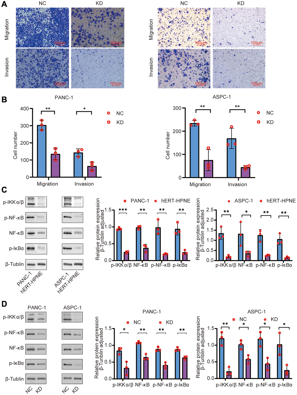 PDAC cells were transiently transfected with siRNA and were seeded in 24-well Transwell chambers (8-μm pore size; Corning, NY, USA) to determine the migratory and invasive capacities. For migration assays, 5 × 104 PDAC cells were placed in 200 μl of serum-free medium in the upper chamber, and 700 μl of medium containing 20% FBS was added to the lower chamber. For the invasion assays, chambers were inserted with 50 μl of 1:8 mixture of Matrigel (ABW, Shanghai, China) and basal medium for three hours in a 37°C incubator. Then, 5 × 104 PDAC cells were seeded in 200 μl of serum-free medium in the upper chamber, and 700 μl of medium containing 20% FBS was added to the lower chamber. After the cells were incubated for 48 h, 4% paraformaldehyde was used to fix the cells for 20 mins, and crystal violet was used to stain the fixed cells for 15 min. The migratory and invasive photos were recorded in five random 100× microscopic fields using an IX71 inverted microscope. ImageJ was used to count the stained cells in photographs of five 100× microscopic fields, and the average number of cells was calculated.