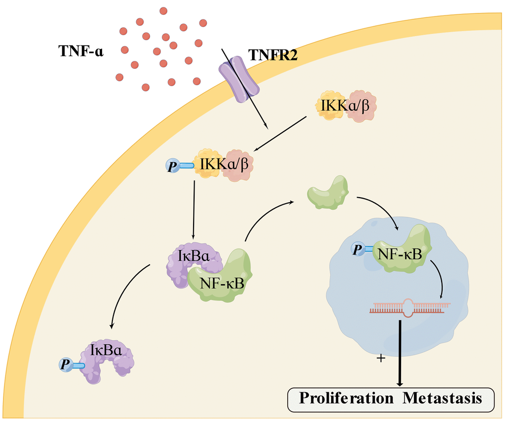 We next investigated the underlying molecular mechanism of TNFR2. In the mid-19th century, Rudolf Virchow et al. found that inflammatory cells were abundant in tumor tissue, and cancer may develop from chronic inflammation [19]. Inflammation is a fundamental cancer-promoting factor [20, 21]. Chronic and persistent inflammation increases malignancy risk and acceleration of malignant progression in most cancers [22]. A recent study found that chronic inflammation enhanced chemotherapy resistance [23, 24]. NF-κB pathway is associated with chemotherapy, radiotherapy resistance, and tumor recurrence in various cancers, particularly in hormone-dependent breast cancer [25]. Other studies found that activation of the NF-κB pathway accelerated the transformation of chronic inflammation into tumors [26] and promoted tumor proliferation, migration, and invasion [27, 28]. Subsequently, we found that TNFR2 and the NF-κB pathway were overexpressed in PDAC cell lines. We silenced the TNFR2 gene using siRNA transient transfection. PDAC cells of NC and KD groups were cultured in a complete medium containing TNF-α after siRNA transient transfection, and western bolting showed that p-IKKα/β, NF-κB, p-NF-κB, p-IκBα protein decreased following TNFR2 silencing. TNF-α binds to TNFR2 on cell membranes, then activates downstream proteins of the NF-κB signaling pathway [12]. As shown in Figure 5, IKKα/β is phosphorylated to p-IKKα/β, which promotes the phosphorylation of IκBα to p-IκBα. Accompanied by the phosphorylation of IκBα, NF-κB detaches from IκBα and translocates into the nucleus. NF-κB transforms to p-NF-κB in the nucleus and contributes to PDAC proliferation and metastasis [29].