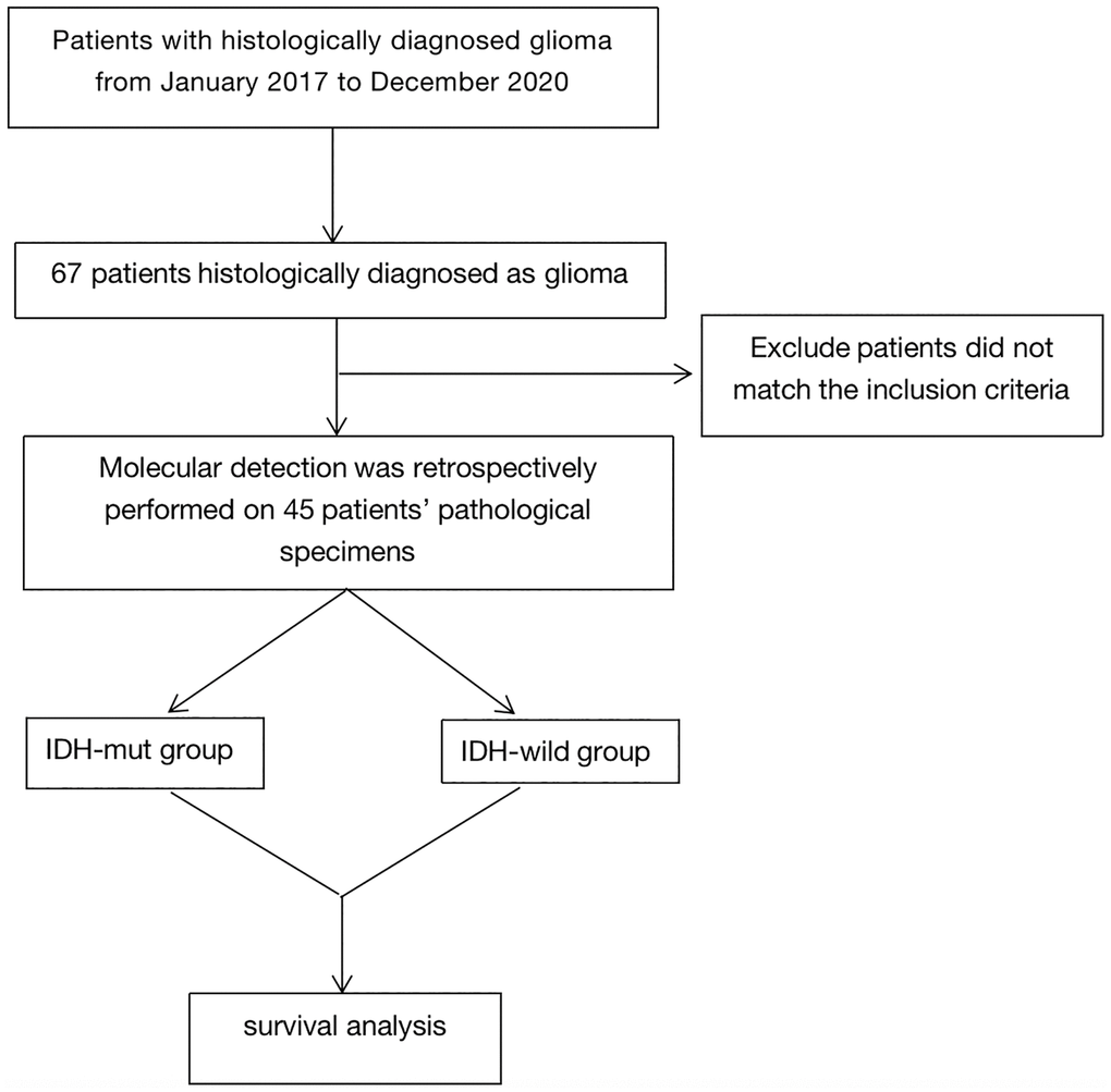 Clinical data on patients’ age, gender, pathological type, WHO grade, preoperative tumor size, surgical resection method, radiotherapy dose, recurrence site from the medical history system of The Second Affiliated Hospital of Guangxi Medical University. All the patients received radiotherapy 4–8 weeks after surgery. According to the status of IDH, we divided enrolled patients into two groups: IDH mutate group (IDH-mut group) and IDH wild group (IDH-wild group), regardless their histopathology status. Patient characteristics were summarized in Table 1, the flow chart was shown in Figure 1.
