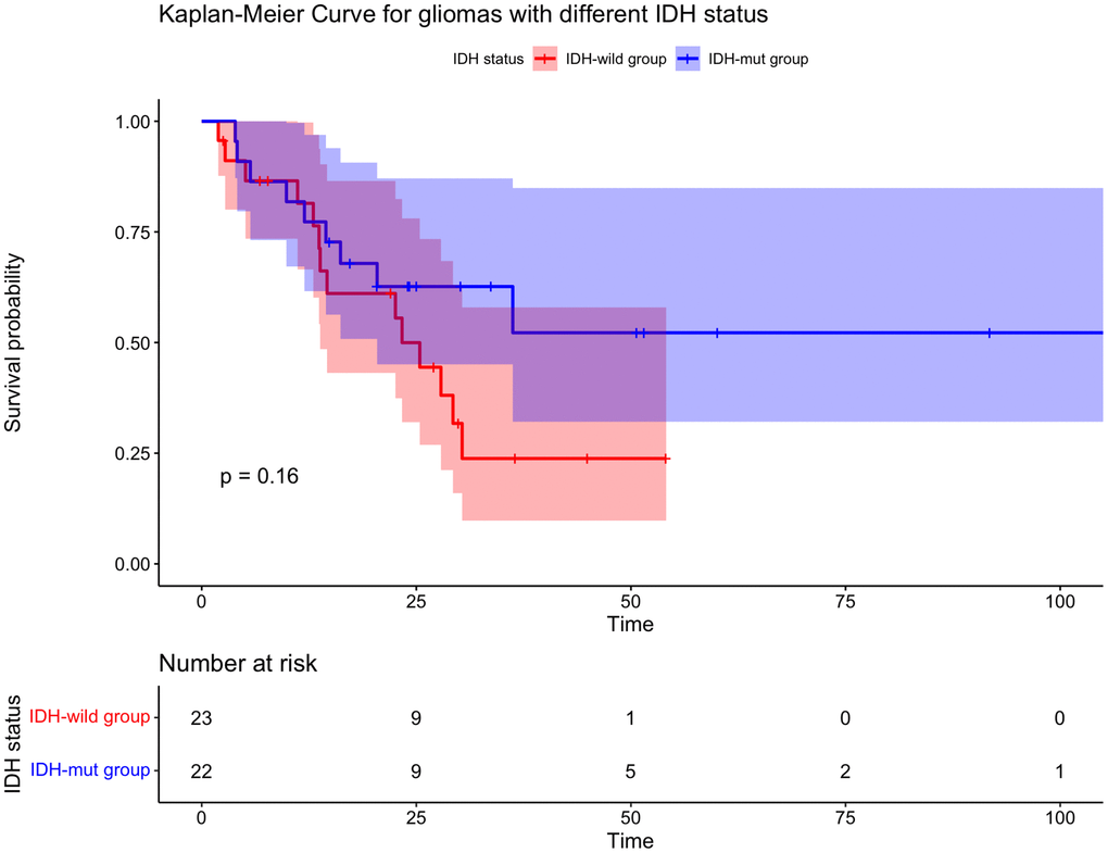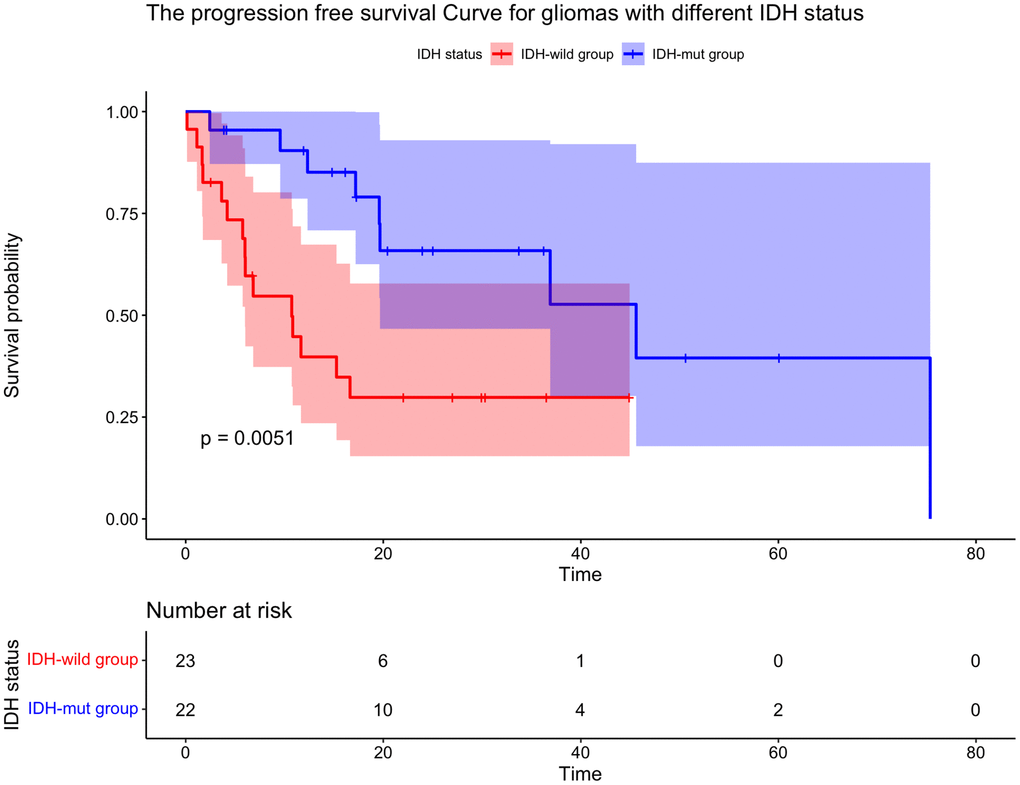 There were 67 patients diagnosed with glioma who treated in our hospital between January 2017 to December 2020. Only 45 patients met the inclusion criteria. The median follow-up time was 22 months (range, 2–108.5 months). The median age was 46 (range, 25 to 70). Of the 45 samples, 22 (48.9%) of the patients with IDH mutation, including 7 patients with astrocytoma (WHO grade 2), 6 with anaplastic astrocytoma (WHO grade 3), 2 with anaplastic oligodendroglioma (WHO grade 3) and 7 with glioblastoma (WHO grade 4). And 23 of 46 (51.1%) patients were ΙDH wild-type, including 4 astrocytoma patients (WHO grade 2), 6 anaplastic astrocytoma patients (WHO grade 3) and 13 glioblastoma patients (WHO grade 4). In IDH-mut group, there were 14 patients had MGMT methylation, 8 were MGMT-nonmethylation. For IDH-wild group, 8 of the 23 patients had MGMT methylation, while 15 patients were MGMT-nonmethylation. All patients underwent postoperative IMRT. A total of 77.3% of the patients (17 of 22) were treated with radiotherapy concurrent temozolomide in IDH-mut group, and 36.4% of the patients (8 of 22) received RT followed by chemotherapy using temozolomide. Meanwhile, all the patients received temozolomide as the concurrent chemotherapy regimen in IDH-wild group, and 11of 23 (47.8%) patients received adjuvant chemotherapy by using temozolomide after RT. The baseline characteristics of patients, stratified by IDH status, were shown in Table 1.