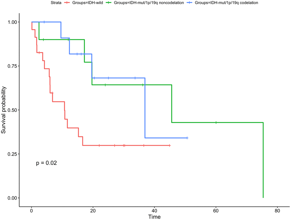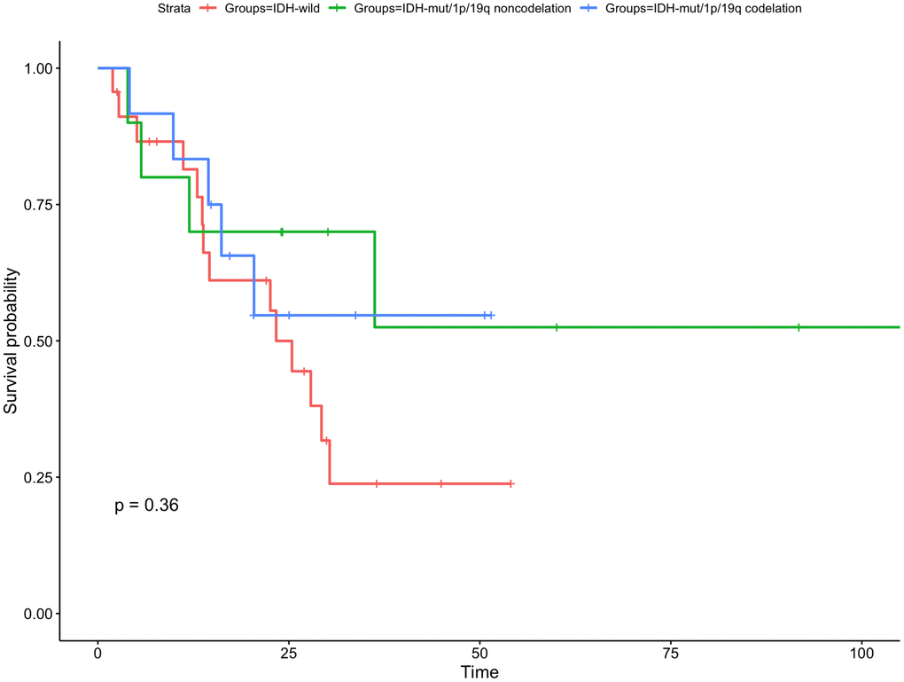 Of the 45 enrolled patients, there were 12 (26.7%) had IDH-mut/1p/19q codeletion, 10 (22.2%) had IDH-mut/1p/19q noncodeletion and 23 (51.1%) were IDH-wild type. The 1-year OS rate was 83.3% for IDH-mut/1p/19q codeletion group, 70.0% for IDH-mut/1p/19q noncodeletion group, and 81.5% for IDH-wild type group (P = 0.36, Figure 4). The rates of 1-year PFS was significantly higher in the IDH-mut/1p/19q codeletion group and IDH-mut/1p/19q noncodeletion group than in IDH-wild group (90.9% vs. 90.0% vs. 39.8%, respectively, P = 0.02, Figure 5).