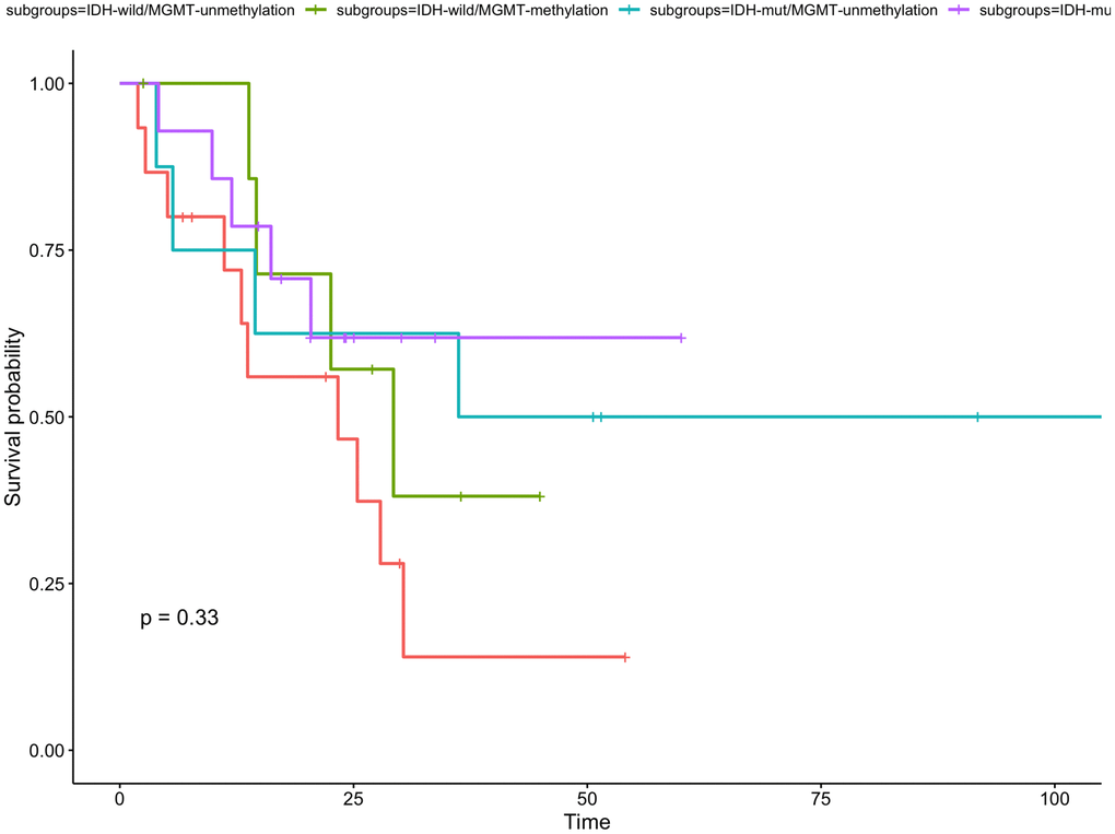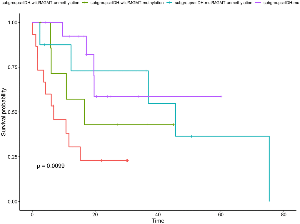 Of the eligible patients profiled for the IDH status and MGMT methylation status according to the 2016 WHO classification, there were 15 (33.3%) had IDH-wild/MGMT-unmethylation, 8 (17.8%) were IDH-wild/MGMT-methylation, 8 (17.8%) were IDH-mut/MGMT-unmethylation and 14 (31.1%) were IDH-mut/MGMT-methylation. The 1-year OS rate was 72.0% for IDH-wild/MGMT-unmethylation group, 71.4% for IDH-wild/MGMT-methylation group, 75.0% for IDH-mut/MGMT-unmethylation group and 78.6% for IDH-mut/MGMT-methylation. The 4 molecular subgroups were no significantly associated with OS (P = 0.33, Figure 6). The 1-year PFS rate was 30.5% for IDH-wild/MGMT-unmethylation group, 57.1% for IDH-wild/MGMT-methylation group, 87.5% for IDH-mut/MGMT-unmethylation group and 92.3% for IDH-mut/MGMT-methylation. The PFS of IDH-mut/MGMT-methylation group were significantly higher than other three molecular subgroups (P = 0.0099, Figure 7).