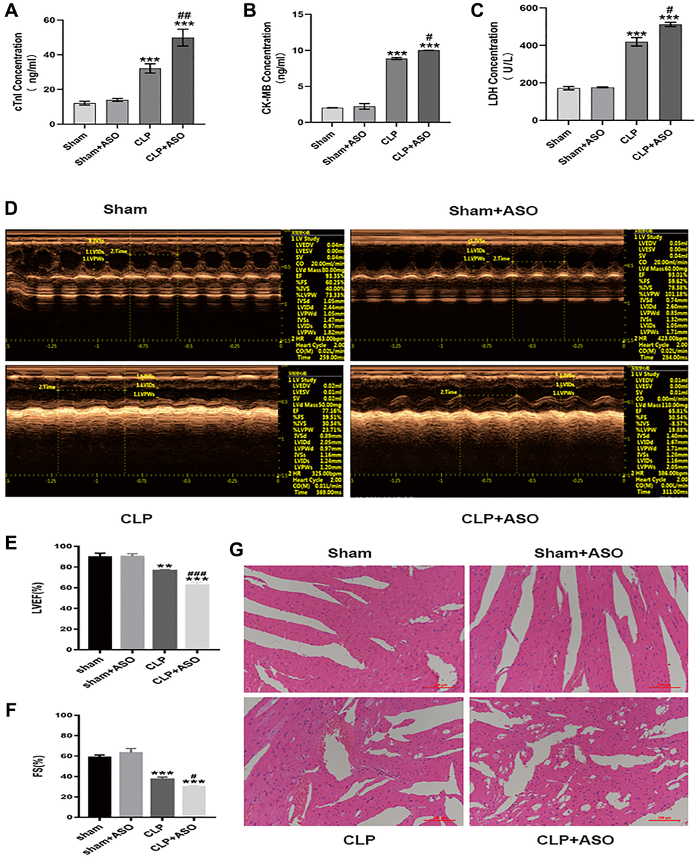 Echocardiography (Figure 2D) revealed a significant decrease in left ventricular ejection fraction (LVEF) and LV systolic function (Fractional shortening; FS) in CLP mouse hearts, as assessed by the cardiac function of each group. (Figure 2E, 2F). Moreover, the CLP + ASO group further decreased LVEF and FS.