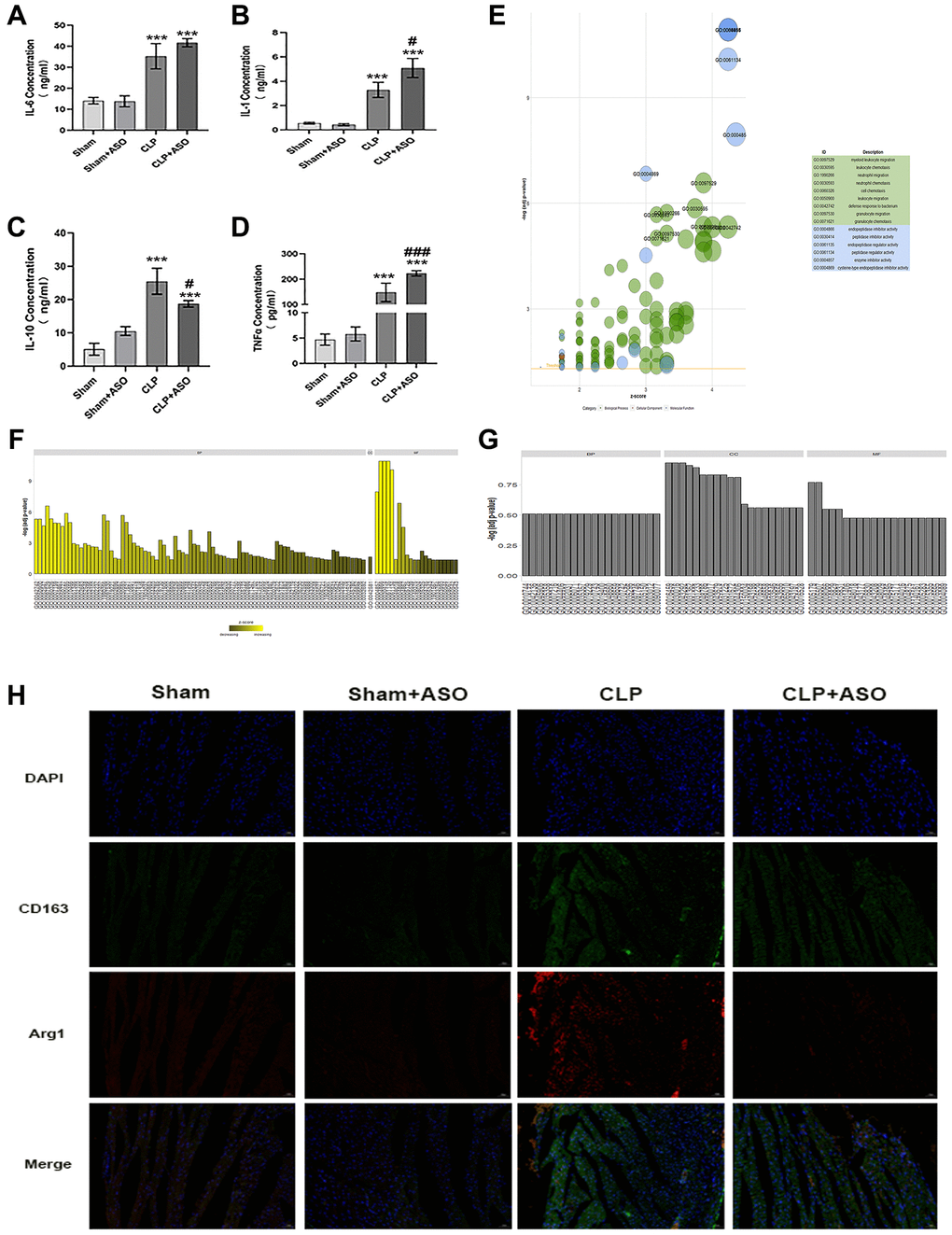 Classically M1 and alternative M2 polarization, with pro- and anti-inflammatory properties, respectively, divide macrophages - heterogeneous immune cells with pleiotropic functions – fundamentally [12]. Characterized by proinflammatory and antimicrobial effects, M1 macrophages release copious amounts of proinflammatory factors such as IL-6, IL-1β, IFN-γ, and TNF-α, which can aggravate the inflammatory response; however, M2 macrophages, which secrete IL-10 and IL-4, have anti-inflammatory effects [20]. Our research revealed that the CLP group had notably higher levels of measured inflammatory factors. The inflammatory release of IL-1β, IL-6, and TNF-α was exacerbated by the serum concentrations of IL-1β, IL-6, IL-10, and TNF-α (Figure 3A, 3B, 3D), and ASO administration further exacerbated this. Notably, the expression of the anti-inflammatory factor IL-10 was decreased (Figure 3C), which is normally released by innate immune cells (e.g., M2 type macrophages), in the CLP + ASO group compared to the CLP group.