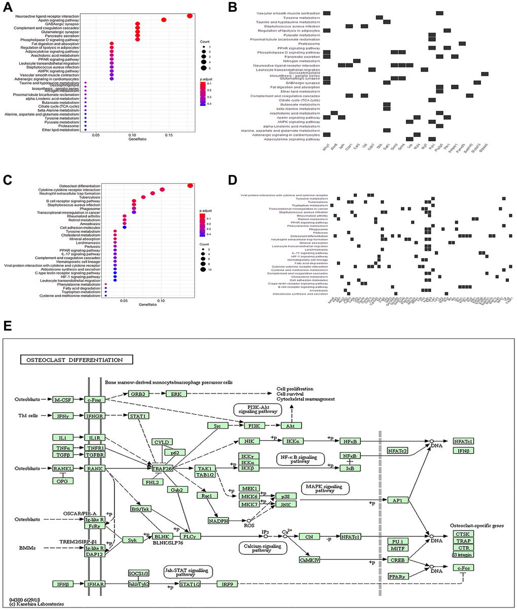 To gain insight into the regulatory mechanism of myocardial injury in CLP mice, we performed a KEGG enrichment analysis on the DEGs previously analyzed. Enriched pathways of osteoclast differentiation, B cell receptor signaling, neutrophil extracellular trap formation, cytokine receptor interaction, staphylococcus aureus infection, tuberculosis, tyrosine metabolism, rheumatoid arthritis, cholesterol metabolism, retinol metabolism, and mineral absorption were revealed in the DEGs’ up-regulated genes (Figure 4A). Downregulated genes were enriched in pathways involved in Apelin signaling, GABAergic synapses, complement and coagulation cascades, neuroactive ligand-receptor interactions, and glutamatergic synapses (Figure 4C). Enriched genes were also introduced into enriched pathways (Figure 4B, 4D). Among these, the KEGG pathways with the strongest association with macrophage polarization were osteoclast differentiation pathways (Figure 4D). Osteoclast differentiation pathways (Figure 4E) were the most strongly correlated with macrophage polarization, and activation of the Src/PI3K/Akt pathway was essential in restraining pro-inflammatory reactions and encouraging anti-inflammatory reactions in macrophages [21].