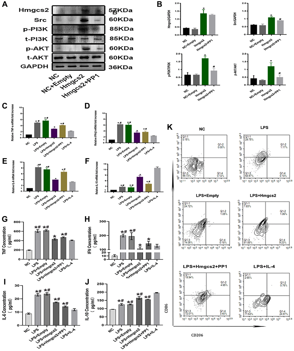 We explored the influence of Hmgcs2 on macrophage polarization, utilizing flow cytometry to quantify macrophage polarization in distinct groups. The results showed that overexpression of Hmgcs2 promoted macrophage M1 to M2 polarization, whereas PP1 administration reversed this phenomenon (Figure 5K).