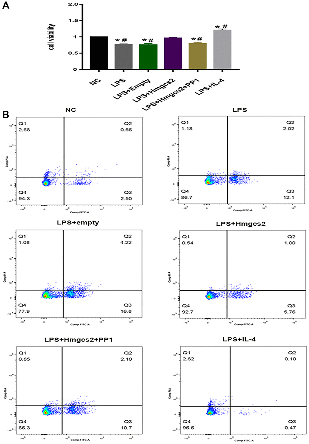 Furthermore, apoptosis of cardiomyocytes was investigated by flow cytometry with a co-cultured experiment. Apoptotic flow cytometry revealed that, in comparison to the NC group, cardiomyocytes in LPS-induced macrophages co-cultured with cardiomyocytes experienced an increase in apoptosis (Figure 6B); however, the LPS+Hmgcs2 group experienced a decrease in apoptosis. The LPS+IL-4 group showed the least apoptosis in co-cultured cardiomyocytes.