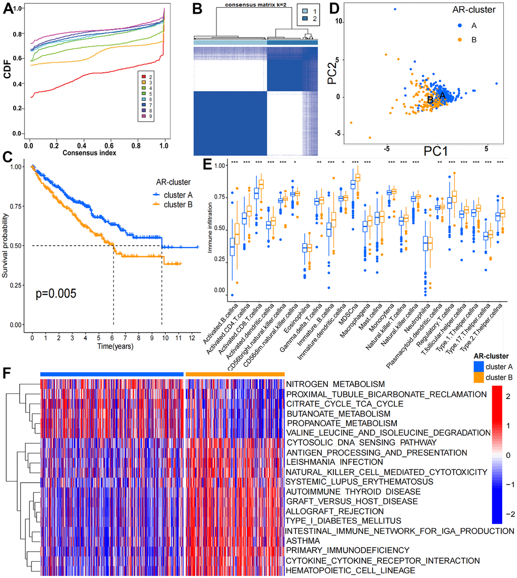 To determine the clinical significance of AR-subgroups, we investigated the association among molecular patterns, clinical features, and survival outcomes. Age, gender, grade, stage, T-stage, M-stage, and N-stage were included as the clinical variables.