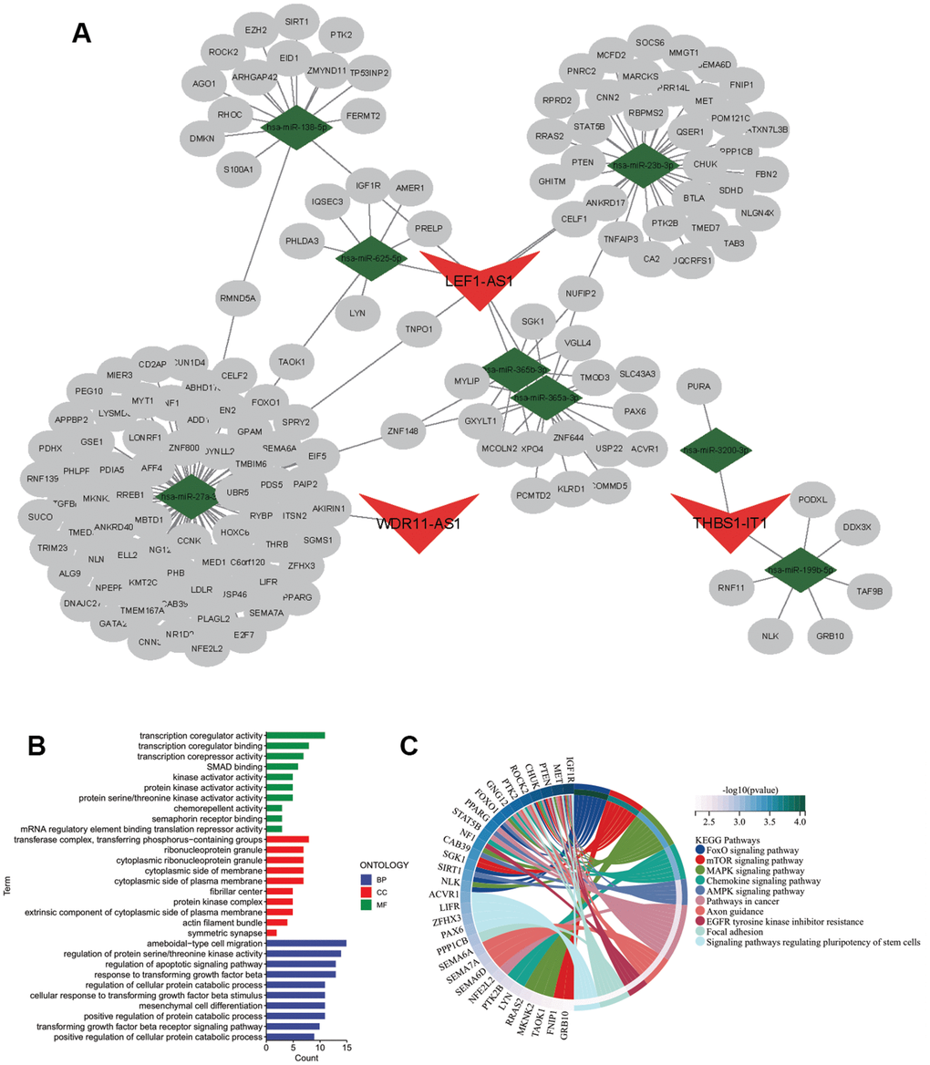 To elucidate the potential regulatory function of CarLncs in aging and KIRC tumorigenesis, a CarLnc-miRNA-mRNA network (Figure 2A) was constructed. Firstly, the potential miRNA targets of the 6 DS-CarLncs (miRNA-Tgt) and the candidate mRNA targets of miRNA-Tgt (mRNA-Tgt) were predicted using online web tools. Considering the AR-subgroups of KIRC were generated based on the expression patterns of 6 DS-CarLncs, differentially expressed mRNA (DE-mRNA) and miRNA (DE-miRNA) between two subgroups were identified as these mRNAs/miRNAs may also associated with these two aging models. Only 8 miRNAs are overlapped between DE-miRNA and miRNA-Tgt which include miR-199b-5p, miR-3200-3p, miR-138-5p, miR-23b-3p, miR-365a-3p, miR-365b-3p, miR-625-5p and miR-27a-3p. These 8 overlapped miRNAs are potential targets of 3 DS-CarLncs, which is THBS1-AS1, LEF1-AS1-201 and WDR11-DT-201. Comparing DE-mRNA and mRNA-Tgt,148 mRNAs were intersected and were retained for further analysis. Finally, a lncRNA-miRNA-mRNA regulatory network was constructed using the 148 mRNAs, the 8 miRNA and the 3 CarLnc (Figure 2A and Supplementary Table 3).