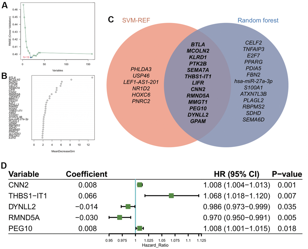 Feature genes are genes that can be used to distinguish the two AR-subgroups. The molecules within CarLnc-miRNA-mRNA network were used to determine the feature genes by random forest (RF) algorithm and support vector machine - recursive feature elimination (SVM-RFE). At the first step, “e1071” [23] and “caret” [24] R packages were utilized for screening the optimal gene sets as the signature of AR-Subgroups using SVM-RFE method [25] as SVM-RFE is an iterative backward elimination procedure for feature selection [24]. Secondly, “randomForest” R package was used to construct the optimal random forest classification model (ntree=500), and then to evaluate the correlation weight of genes within the network to characterize the effect of the gene on aging-related classification (indicator “MeanDecreaseGini”) [26]. Finally, the intersected genes between the optimal gene set screened by the SVM-RFE algorithm and the top-ranked genes with “MeanDecreaseGini” ≥2.0 were regarded as aging-related feature genes in KIRC patients.
