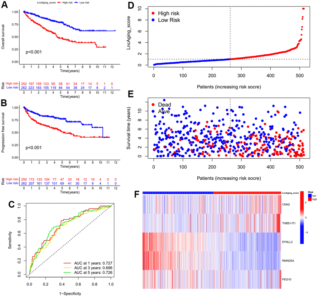 Over the past decades, great efforts have been made to propel a better understanding of the driving forces that lead to aging and cancer [39]. To discipline the vital and complex links between aging, cellular senescence and cancer, the prognostic power of 8 candidate aging related lncRNAs (CarLncs) in KIRC were evaluated. Among these CarLncs, THBS1-IT1, LEF1-AS1-201 and WDR11-DT-201 showed significant variations between KIRC and tumor-adjacent tissues in TCGA data while THBS1-AS1 and DCHS1-AS1 displayed non-significant changes. DCHS1-AS1 is sequence conserved and transcribed from the antisense of dachsous cadherin-related (DCHS1) [8]. Although the function of these dysregulated lncRNAs in KIRC remains to be explored, our results summarized a broad overview of their expression patterns in KIRC, which provided new insights into aging, cancer and lncRNA studies. Comparing with previous model that utilized m6A-Related lncRNA as signatures [14], we estimated the predictive power of 8 aging related lncRNAs in KIRC prognosis via a series of analyses, which enhanced the understanding of the associations between aging and cancers.