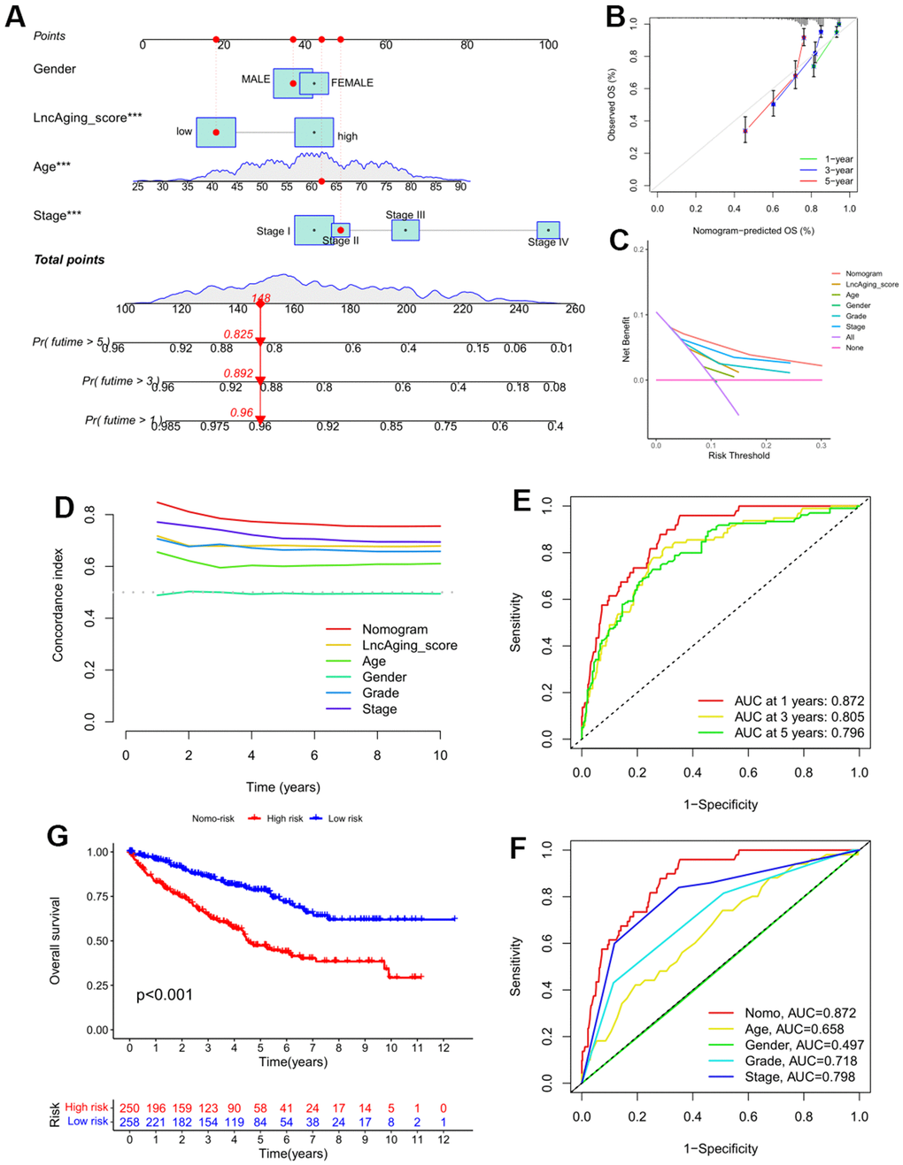 To further assess the significance of LncAging_score in KIRC prognosis, LncAging_score together with three clinical parameters (age, sex and stage information) were incorporated as variables to predict 1-, 3-, and 5-year OS for the entire KIRC cohort by nomogram (Figure 5A). Calibration curves of the established nomogram presented good consistency between actual observations and predicted values (Figure 5B). LncAging_score combined with the three clinical factors presented the best net benefits than single variable for predicting prognosis (Figure 5C, 5D). The AUC values of Nomo-risk at 1-, 3-, and 5-year risks were presented in Figure 5E. ROC curves of the nomogram as well as four clinical factors (age, gender, grade and stage) for 1-year risk were shown in Figure 5F. The range of AUC values of Nomo-risk was 0.796-0.872, which suggested that our nomogram achieves a good degree of accuracy for KIRC prognosis. Additionally, survival analysis based on the risk score of the nomogram showed that high Nomo-risk is related with poor prognosis (Figure 5G, P < 0.001).