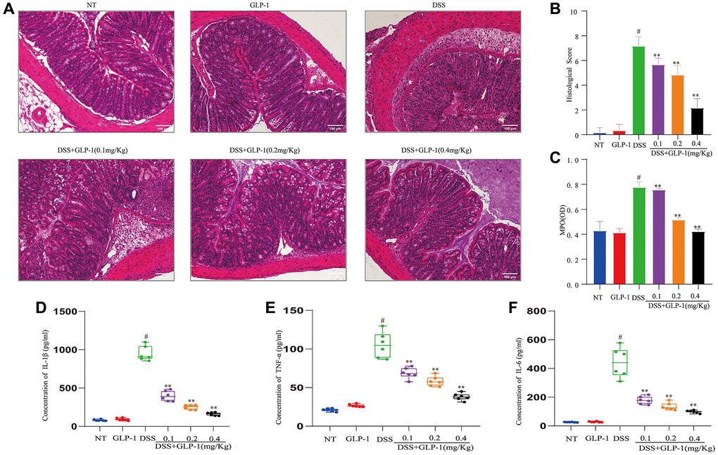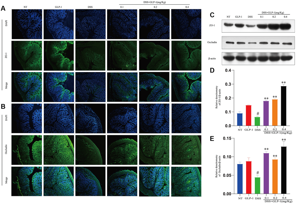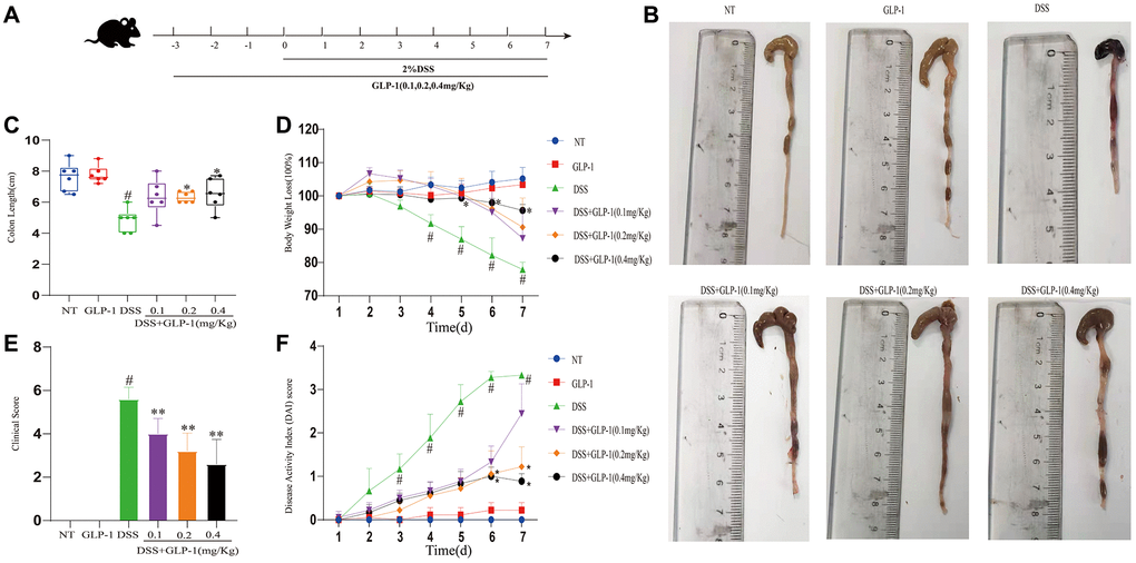 GLP-1 (Benaglutide Injection) was obtained from Shanghai Renhui Biopharmaceutical Co., Ltd. (Shanghai, China); DSS (36–50 kDa) from MP Biochemicals (Santa Ana, CA, USA); and TRIzol reagent from Invitrogen (Carlsbad, CA, USA). Primary antibodies for Occludin and ZO-1 were purchased from Abcam (Cambridge, United Kingdom); Akt, p-Akt, NF-κB p65, p-NF-κB p65, P38, p-P38, JNK, p-JNK, ERK1/2, p-ERK1/2 from Cell Signaling Technology (Danvers, MA, USA); β-actin was obtained from Bosterbio (Pleasanton, CA, USA). Antibodies for nitric oxide synthase (iNOS) and cyclooxygenase 2 (COX2) were purchased from Abcam (Cambridge, United Kingdom). ELISA kit was obtained from BioLegend (San Diego, CA, USA).
