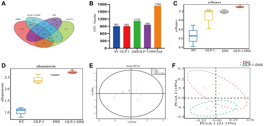 The α-diversity analysis was mainly related to the richness and diversity of the microbial communities. There was a sharp decline in the Chao 1 and Shannon indices in the DSS-induced mice model compared to the GLP-1 treated group (p < 0.05) (Figure 5C, 5D), indicating that GLP-1 treatment promotes the diversity of the bacterial community. The analysis of β-diversity by PCA and PCoA plots showed a remarkable difference in the species diversity between the control and the DSS-induced mice (Figure 5E, 5F). Interestingly, GLP-1 treatment enhanced the richness and diversity of the microbial community (Figure 5).
