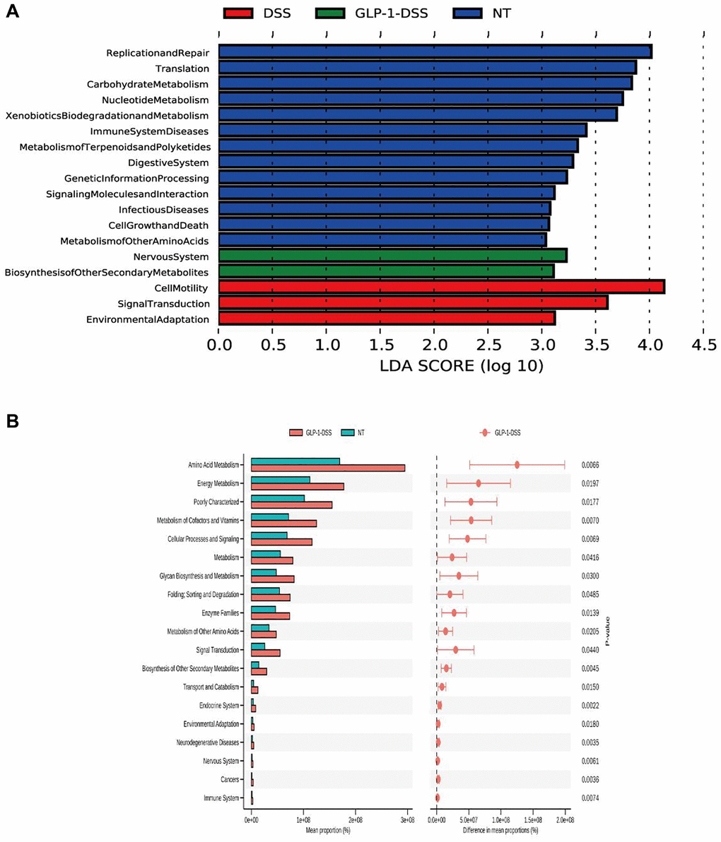 Analyses of relative microbial abundance at that phylum and family levels revealed that GLP-1 administration was linked to increase in the relative abundance of Firmicutes and Lactobacillaceae species in the GLP-1-DSS group relative to the DSS group (Figure 6A, 6B). The LEfSe (Line Discriminant Analysis (LDA) Effect Size) were next conducted to identify groups of bacteria that differed significantly among these four groups (Figure 6C, 6D). The relative abundance of Bifidobacteriaceae, Lactobacillaceae, Faecalibaculum, and Ruminococcaceae were higher after GLP-1 treatment than in DSS (p < 0.01) mice alone (Figure 6E–6H). GLP-1 re-established intestinal microbiota. We utilized COG and KEGG databases to analyze the functions of genes in the sequenced microbial genomes. We focused on proteins involved in signaling pathways (Figure 7). Nineteen aberrant enrichments KEGG pathways were displayed between DSS-GLP-1 and NT groups, including the microbial genes related to carbohydrate metabolism, nucleotide metabolism, lipid metabolism, metabolism of cofactors and vitamins, and amino acid metabolism.