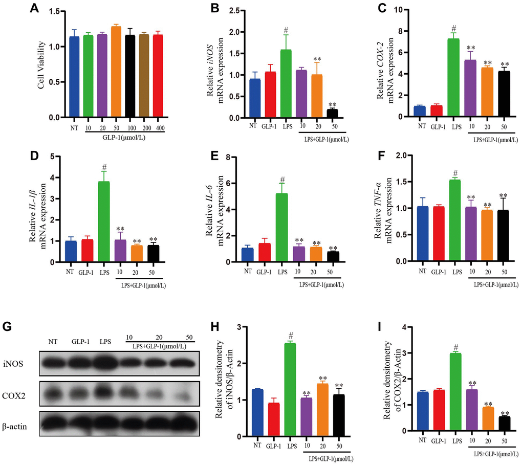 To test the anti-inflammation activity of GLP-1 on RAW264.7 cells, we took GLP-1 solutions in different concentrations (10, 20, 50, 100, 200, 400 μmol/L) revealing it to be non-toxic (Figure 8A). LPS-induced RAW264.7 cells were incubated in three different GLP-1 solutions (10, 20, 50 μmol/L) for 4 h. The transcription of IL-1β, IL-6, and TNF-α was increased by LPS as expected, but GLP-1 treatment irrespective of their concentration (10, 20, 50 μmol/L) restored these levels (p < 0.01) (Figure 8D–8F). The result also showed that iNOS and COX-2 expression levels in LPS-induced RAW264.7 cells were significantly enhanced. Interestingly, GLP-1 inhibited the level of mRNA transcription and protein expression both of iNOS and COX-2 (p < 0.01) (Figure 8B, 8C and 8G–8I). The above results suggest that GLP-1 can suppress the inflammatory response in LPS-induced RAW264.7 cells.