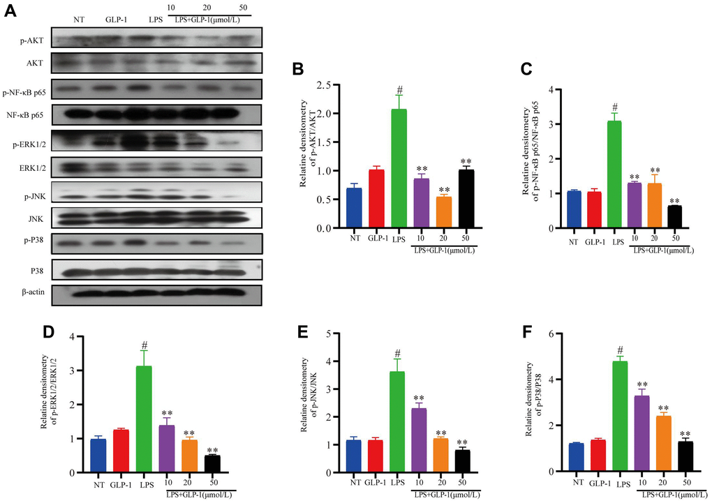 In vivo results have already shown that GLP-1 inhibits phosphorylation of AKT, NF-κB p65 and MAPK (this study). We also show that GLP-1 inhibits inflammatory pathways in the LPS-induced RAW264.7 cells. The level of phosphorylated NF-κB-p65 and AKT were also higher in these cells (Figure 9A–9C). Phosphorylation of ERK1/2, P38 and JNK increased in LPS-induced macrophages (Figure 9D–9F). Their levels were restored with GLP-1 treatment, similar to what we have shown in the mice model (this study).
