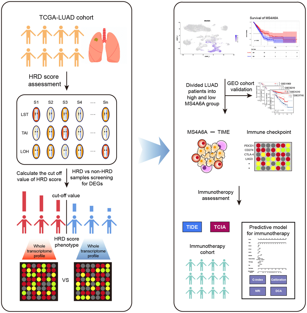 To explore the association between HRD-induced genomic instability and immunotherapy biomarkers in LUAD patients, we extracted transcriptomic data and mutation data from The Cancer Genome Atlas (TCGA) database. We calculated HRD scores for each LUAD patient. By analyzing the differences in transcriptome levels between the HRD and non-HRD groups, we observed elevated MS4A6A expression in HRD patients and that these patients had a better prognosis. Four datasets from the Gene Expression Omnibus (GEO) database were used to validate our results. Furthermore, we revealed that MS4A6A expression was positively correlated with multiple infiltrated immune cells in the TME, such as CD4+ T cells, CD8+ T cells, as well as immune checkpoints (ICPs), such as PD-1 and PD-L1. IMvigor210, an immunotherapy cohort, suggested that MS4A6A was a better predictor than PD-1, PD-L1, or CTLA-4. Therefore, the findings of this study provide possible directions for immunotherapy biomarkers and are valuable for understanding the relationship between genomic instability and TME in LUAD patients and improving clinical outcomes in patients undergoing immunotherapy (Figure 1).