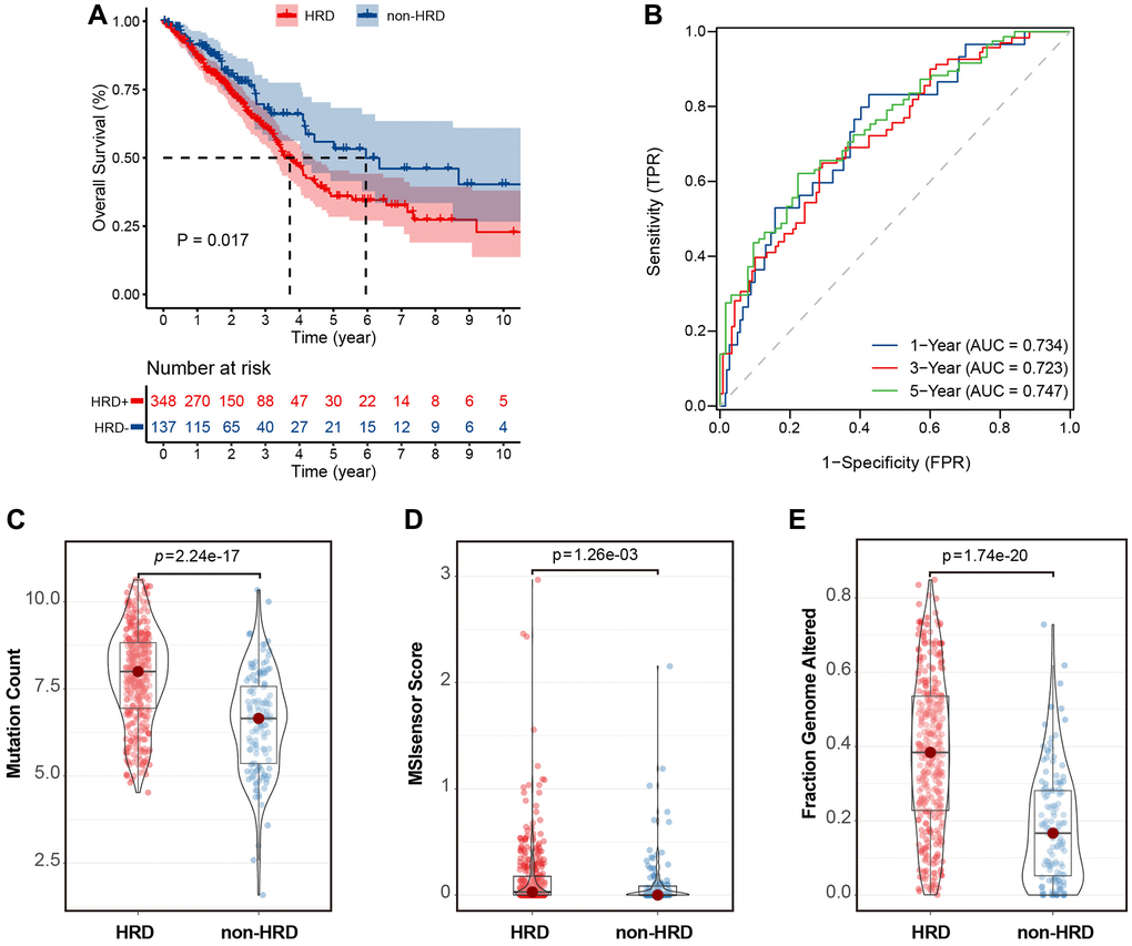 The HRD scores were calculated based on the LOU, LST, and TAI scores in the TCGA-LUAD dataset. The optimal cut-off value of the HRD score was determined by calculating the minimum P-value in the log-rank test. Patients with HRD scores >15 were considered to belong to the HRD group, whereas those with HRD scores ≤15 were considered to belong to the non-HRD group. The KM curve showed that the overall survival (OS) of patients in the non-HRD group was much longer than that of patients in the HRD group (log-rank test, P = 0.017) (Figure 2A). The 1-, 3-, and 5-year ROC curves of survival were plotted. Their AUCs were estimated to be 0.734, 0.723, and 0.747, respectively (Figure 2B), indicating that the survival between HRD and non-HRD patients at 1, 3, and 5 years was significantly different and that the HRD score may serve as a potential prognostic biomarker. Subsequently, we investigated the relationship between HRD scores and other genomic instability features, such as MSI-sensor, genomic alteration fractions, and somatic mutation counts. The results revealed that the median somatic cumulative mutation count was significantly higher in the HRD group than in the non-HRD group (Wilcoxon signed-rank test, P < 0.001; Figure 2C) and was higher in the HRD group than in the non-HRD group (Wilcoxon signed-rank test, P < 0.001; Figure 2D). The fraction genome altered was also higher in the HRD group (Wilcoxon signed-rank test, P < 0.0001; Figure 2E). These findings indicate that patients with HRD have significantly higher genomic instability than those without HRD.