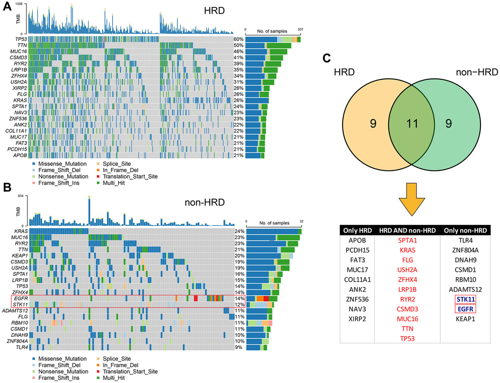 Genomic features, such as oncogene activation (e.g., ERBB2 amplification, EGFR tyrosine kinase mutations) and tumor suppressor gene inactivation (e.g., MMR, BRCA1/2), have been shown to strongly correlate with the clinical response to targeted therapies. Therefore, we compared the mutation landscape between the HRD and non-HRD groups. (Figure 3A, 3B) The results showed that the mutation landscape of the non-HRD group was significantly different from that of the HRD group. Only 11 of the top 20 genes with the highest mutation rates in the two groups overlapped (Figure 3C), and the mutation frequencies of the overlapping genes also differed significantly. For example, the TP53 mutation frequency was 60% and 14% in the HRD and non-HRD groups, respectively. Furthermore, by screening actionable genes in the OncoKB database (https://www.oncokb.org/actionableGenes), two of the 20 genes with the highest mutation frequency in the non-HRD group were identified as biomarkers for targeted drugs (STK11 and EGFR). The mutation frequencies of these two genes in the non-HRD group were 14% and 12%, respectively. These results showed that HRD and non-HRD patients had different mutated genes. Non-HRD patients had actionable genes and drug targets suitable for targeted therapy. It further supported HRD as a potential biomarker for LUAD.