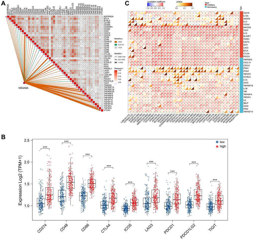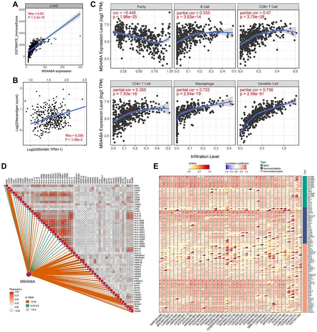 To investigate the abundance of immune cell infiltration in bulk tumor tissues, we used the Tumor Immune Estimation Resource (TIMER) database (https://cistrome.shinyapps.io/timer/) to predict the relative abundance of six types of infiltrating immune cells, including macrophages, dendritic cells, B cells, T cells, and neutrophils. Additionally, we extracted the expression of antigen-presentation-related genes, including those encoding MHC class I/II (I: HLA-A, HLA-B, and HLA-C; II: HLA-DP, HLA-DM, HLA-DOA, HLA-DOB, HLA-DQ, and HLA-DR) and antigen-binding molecules such as B2M and TAP1/2, and performed a correlation analysis between the expression of these molecules and MS4A6A.