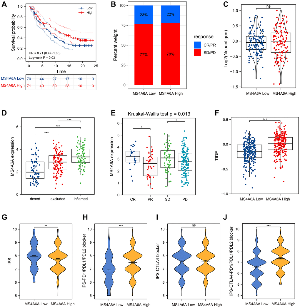 We then focused on immunotherapy-related datasets. To further confirm the predictive value of MS4A6A for immune checkpoint blockade (ICB) treatment, we collected transcriptomic profiles and clinical information from the uroepithelial carcinoma (UC) immunotherapy cohort (IMvigor210) [39]. Patients with high MS4A6A expression showed a more pronounced clinical benefit and significantly longer survival. (Figure 7A). In addition, patients with high MS4A6A expression had a significant treatment effect and immune response to PD-L1 blockade compared with patients with low MS4A6A gene expression (Figure 7B). When comparing neoantigen loads, no significant differences were found between the two groups with high or low MS4A6A expression (Figure 7C). However, patients with high MS4A6A expression had significantly higher tumor immunophenotypes and a better response to immunotherapy compared to those with lower expression (Figure 7D, 7E).