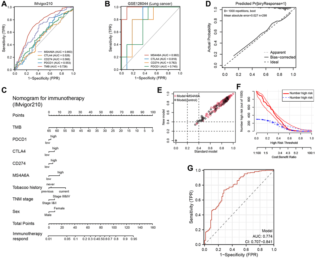 In the investigation of the IMvigor210 and GSE126044 cohorts, we assessed the accuracy of MS4A6A against common immunotherapy-related markers, including TMB, PD-1, PD-L1, and CTLA4. We constructed a clinical prediction model that evaluated the effect of response to immunotherapy using logistic regression. Bootstrapping was used with 1000 iterations for re-sampling. A calibration curve was used to measure the consistency of the model. An integrated discrimination improvement (IDI) curve was used to assess its improvement, and decision curve analysis (DCA) was used to measure its clinical effect.