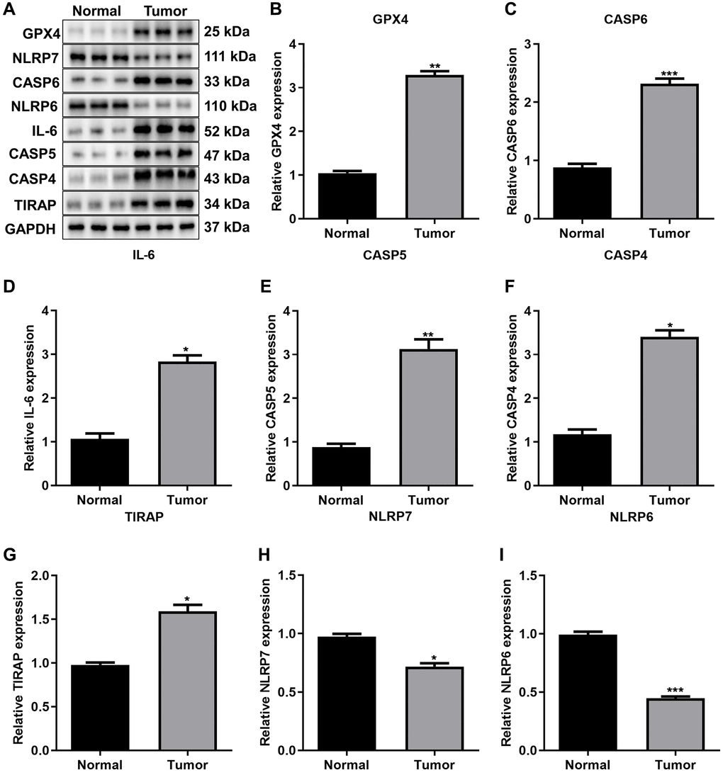 Through western blot, we validated the transcriptomic levels of such prognostic pyroptosis-relevant genes in three paired gastric cancer tissues and normal tissues (Figure 10A). Our results confirmed that the expression of GPX4 (Figure 10B), CASP6 (Figure 10C), IL-6 (Figure 10D), CASP5 (Figure 10E), CASP4 (Figure 10F), and TIRAP (Figure 10G) was greatly up-regulated in gastric tumors relative to normal tissues. Meanwhile, the expression of NLRP7 (Figure 10H) and NLRP6 (Figure 10I) was greatly attenuated in gastric cancer tissues than controls. Above evidence confirmed the abnormal expression of the prognostic pyroptosis-related genes in gastric cancer.