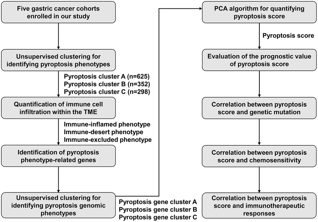 Collectively, this study comprehensively assessed the pyroptosis phenotypes across 1275 gastric cancer patients. The three pyroptosis phenotypes were characterized by distinct survival outcomes and immunophenotypes, proving pyroptosis exerts a prominent implication in the modulation of tumor immunity. Moreover, evaluation of the pyroptosis score of individual tumors might more precisely guide therapeutic strategies for individual patients.