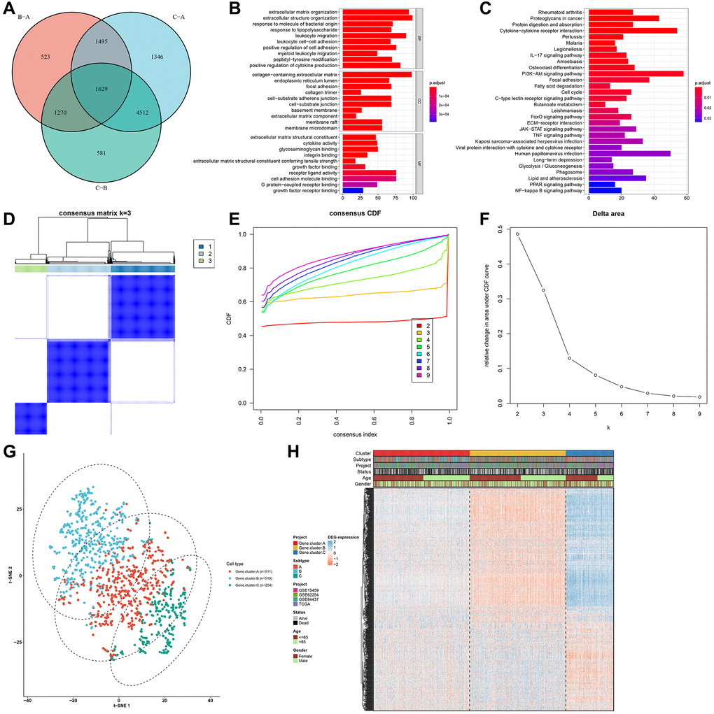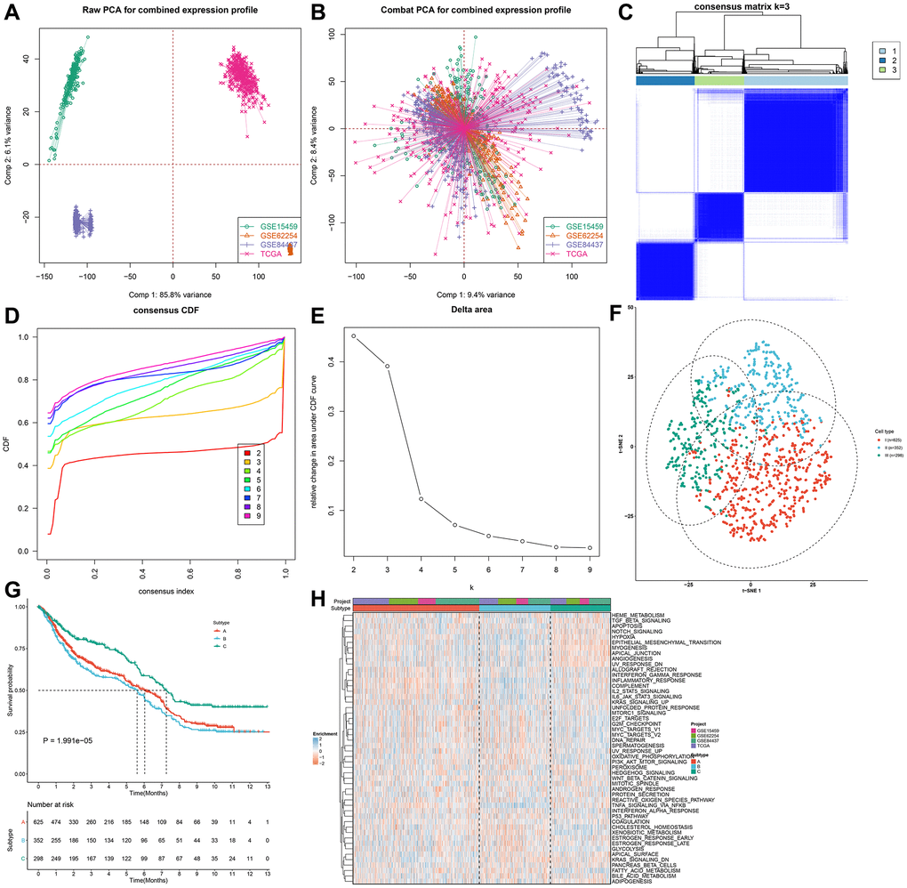 Four gastric cancer cohorts (GSE15459, GSE62254, GSE84437 and TCGA-STAD) were integrated and batch effects were removed (Figure 2A, 2B). Finally, 1275 gastric cancer patients were integrated as the meta-cohort. Univariate-cox regression analysis of 33 pyroptosis-related genes showed that GPX4 (HR: 1.24 (1.06–1.46); p = 0.008), NLRP7 (HR: 0.86 (0.76–0.96; p = 0.009), CASP6 (HR: 0.87: (0.76–0.99); p = 0.032), NLRP6 (HR: 0.90 (0.82–0.99); p = 0.04), IL6 (HR: 1.07 (1.00–1.13); p = 0.047), CASP5 (HR: 0.90 (0.82–0.99); p = 0.023), CASP4 (HR: 0.84 (0.71–0.999); p = 0.048) and TIRAP (HR: 0.73 (0.59–0.91); p = 0.004) had significant correlations to prognosis across 1275 gastric cancer patients. Through the ConsensusClusterPlus package, we stratified gastric cancer specimens to three different pyroptosis phenotypes according to the expressions of above 8 prognostic pyroptosis-related genes with unsupervised clustering method (Figure 2C–2E; Supplementary Table 1). We named these phenotypes as pyroptosis cluster A (n = 625), B (n = 352) and C (n = 298). There were remarkable differences in the transcriptional profiles of the prognostic pyroptosis-relevant gene set among three diverse pyroptosis phenotypes (Figure 2F). Prognostic analysis for the three pyroptosis phenotypes showed the particularly prominent survival advantage in pyroptosis cluster-C, while pyroptosis cluster-B displayed the poorest survival outcomes (Figure 2G). The accuracy of this pyroptosis-related classification was externally proven in the GSE26253 (Supplementary Figure 1A–1D). The differences in prognosis among three pyroptosis phenotypes were also confirmed in the GSE26253 cohort (Supplementary Figure 1E).