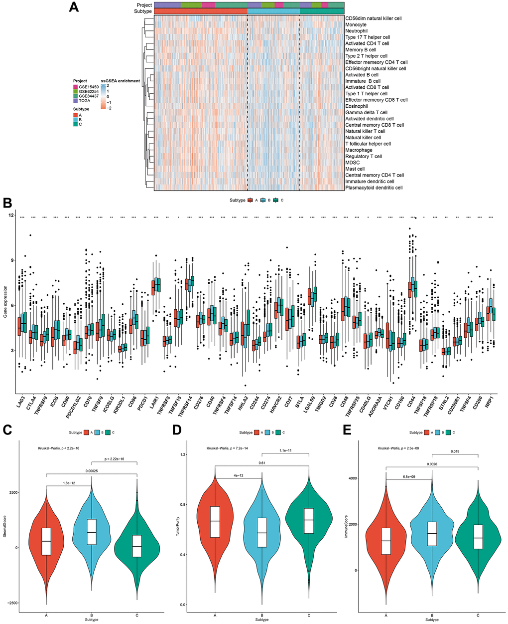 For uncovering potential biomolecular alterations in three different pyroptosis phenotypes, this study carried out GSVA on these 50 hallmark gene sets. We investigated that pyroptosis cluster-C owned distinct enrichment by stromal pathways (e.g., TGF-β signaling, epithelial mesenchymal transition and angiogenesis; Figure 2H). Pyroptosis cluster-B was highly enriched in carcinogenic activation pathways such as PI3K-AKT-mTOR signaling, Wnt-β-catenin signaling, glycolysis and KRAS signaling. Moreover, pyroptosis cluster-A markedly displayed the activation of immune-relevant processes like allograft rejection, interferon gamma response, inflammatory response, complement, IL2-STAT5 signaling and IL6-JAK-STAT3 signaling. These data were indicative of the survival outcomes of the three pyroptosis phenotypes. Moreover, ssGSEA was adopted for estimating the abundant levels of 28 immune cell populations within the TME among distinct pyroptosis phenotypes. Immune-excluded phenotype is rich in immune cells that are reserved in the matrix ambient the tumor cell nest instead of penetrating its parenchyma [20]. Pyroptosis cluster-C could be categorized as immune-excluded tumors with innate immune cell infiltrations as well as stromal activation (Figure 3A). The cluster-B could be categorized as immune-desert tumors with low infiltration levels of nearly all immune cells, indicative of immunity suppression. Moreover, the cluster-A could be categorized as immune-inflamed tumors with rich adaptive immune cells as well as immune activation. The immune infiltration traits across three pyroptosis phenotypes were confirmed via CIBERSORT algorithm (Supplementary Figure 2). Figure 3B showed the prominent heterogeneity in immune checkpoints among pyroptosis phenotypes. Pyroptosis cluster-C exhibited the highest expression of LAG3, CTLA4, TNFRSF9, ICOS, CD80, TNFSF9, ICOSLG, KIR3DL1, PDCD-1, TNFRSF8, TNFRSF15, TNFRSF14, HHLA2, CD244, CD27, BTLA, LGALS9, TMIGD2, CD28, TNFRSF25, CD40LG, CD160, and CD200R1. Through ESTIMATE algorithm, we quantified the entire infiltrations of immune/stromal cells or tumor purity among the pyroptosis phenotypes. Our results showed that pyroptosis cluster-B had the highest stromal score, followed by pyroptosis cluster-A and pyroptosis cluster-C (Figure 3C). Inversely, pyroptosis cluster-B displayed the lower tumor purity, indicating that tumors in the cluster-B were potentially neighbored by rich non-cancer cells such as stromal/immune cells (Figure 3D). In Figure 3E, pyroptosis cluster-B had the highest immune score, followed by pyroptosis cluster-A and pyroptosis cluster-C. Collectively, our data demonstrated that the different pyroptosis phenotypes had the features of distinct immune landscapes.