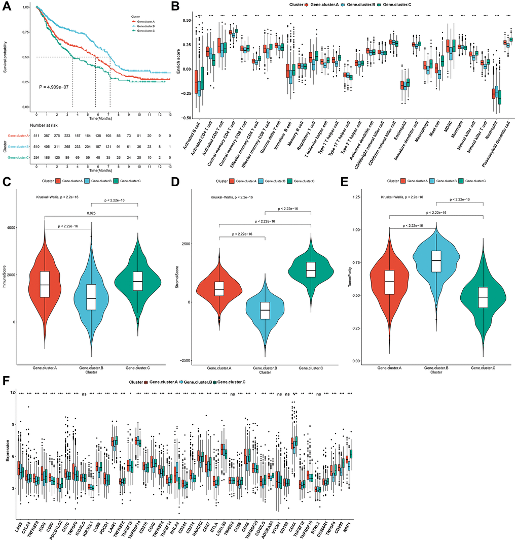 Survival analysis showed the prominent prognostic differences among three pyroptosis genomic phenotypes in the gastric cancer meta-cohort. Pyroptosis gene cluster-C owned the poorest prognosis, while pyroptosis gene cluster-B exhibited a significant survival advantage (Figure 5A). Consistent with pyroptosis phenotypes, pyroptosis genomic cluster-C could be classified into immune-excluded tumors with innate immune cell infiltrations as well as stromal cells, with the genomic cluster-B categorized into immune-desert tumors with immunity suppression, and the genomic cluster-A categorized into immune-inflamed tumors with rich adaptive immune cells as well as immune activation (Figure 5B–5E). The heterogeneity in transcriptomic levels of immune checkpoints was also investigated across three pyroptosis genomic phenotypes (Figure 5F).