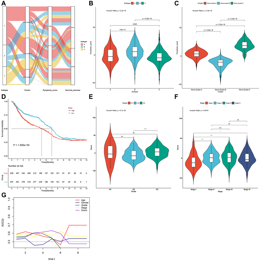 To accurately quantify pyroptosis phenotypes in individual gastric cancer, this study proposed a scoring system named the pyroptosis score according to the pyroptosis phenotype-relevant gene signatures with PCA algorithm. Alluvial diagram showed the heterogeneity of the quantification of pyroptosis score among different pyroptosis phenotypes, pyroptosis genomic phenotypes and survival status (Figure 6A). Notably, pyroptosis cluster-B owned the strongest pyroptosis score, with subsequent cluster-A or cluster-C (Figure 6B). Moreover, pyroptosis genomic cluster-C displayed the strongest pyroptosis score, with subsequent cluster-A or cluster-B (Figure 6C). Next, gastric tumors in the meta-cohort were stratified as low or high pyroptosis score group. The efficiency of the scoring system in inferring survival outcomes was then observed. In Figure 6D, high pyroptosis score displayed poorer survival. The pyroptosis score distribution across different clinical characteristics was also analyzed. Patients with advanced grade and stage had higher pyroptosis score (Figure 6E, 6F). Further analysis of time-independent ROC curves confirmed the well performance of the scoring system (Figure 6G). Thus, the scoring system could be utilized for evaluating certain clinicopathological characteristics (grade and stage) of gastric cancer patients.