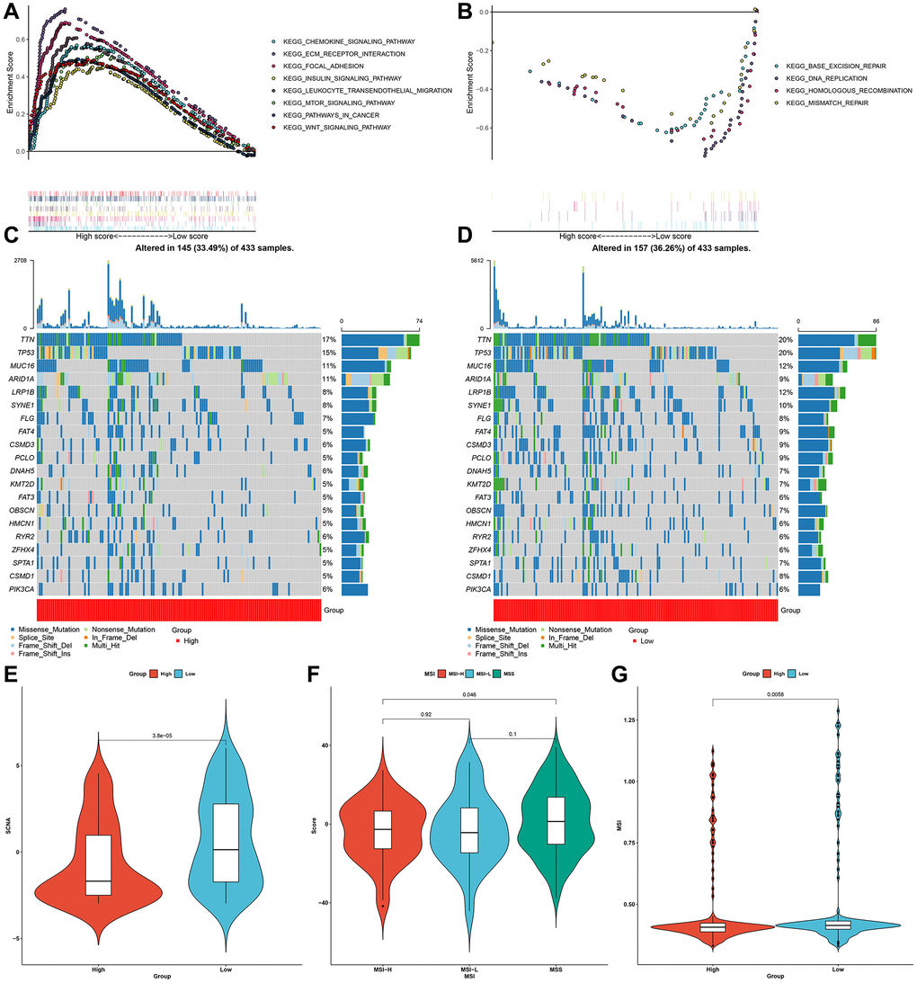 GSEA results uncovered that high pyroptosis score was significantly connected to oncogenic or immune-related pathways (Figure 7A), whereas low pyroptosis score exhibited significant associations with genetic mutations (Figure 7B). Significantly mutated genes were compared in two groups. As shown in mutational landscape, higher somatic mutational frequency was found in low pyroptosis score group (33.49% vs. 36.26%; Figure 7C, 7D). TTN (17% vs. 20%), TP53 (15% vs. 20%), MUC16 (11% vs. 12%), etc. exhibited increased genetic mutation frequencies for patients with low pyroptosis score. Somatic copy number alterations (SCNA) exhibit positive correlation to immune evasion as well as proliferative capacity of tumor cells. We observed an increased SCNA for patients with low pyroptosis score (Figure 7E). The high microsatellite instability (MSI-H) subtype, characterized by favorable survival outcomes exhibited distinct correlation to lower pyroptosis score, while low MSI (MSI-L) and microsatellite stable (MSS) status displayed higher pyroptosis score (Figure 7F, 7G).