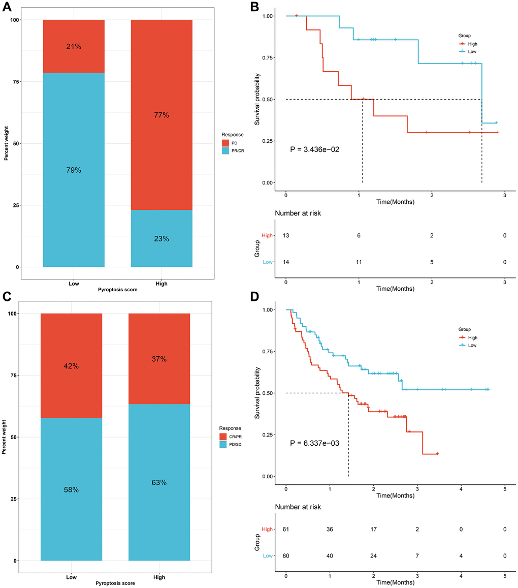 We evaluated the interaction of the pyroptosis score with several signaling pathways by Spearman analyses. Consequently, the pyroptosis score presented negative correlations to DNA damage repair processes but was positively correlated to stromal-related signatures in the meta-cohort (Figure 8A). Immunotherapies like CTLA-4/PD-1 blockage have strictly made progress for anti-cancer treatment. Tumor mutation burden (TMB) has become an effective biomarker for predicting immunotherapeutic response. Low pyroptosis score presented notable connection to increased TMB in TCGA-STAD cohort (Figure 8B). IPS is also recommended as an estimator of immunotherapeutic efficacy. The analysis revealed that IPS score of CTLA-4/PD-1 inhibitor treatment was distinctly elevated in low pyroptosis score in TCGA-STAD cohort (Figure 8C–8F). The response to common chemotherapeutic agents was estimated in each sample from the meta-cohort (Figure 8G–8J). We observed that high pyroptosis score exhibited markedly reduced IC50 values of cisplatin and docetaxel as well as low pyroptosis score had significantly increased IC50 value of paclitaxel. Thus, patients with high pyroptosis score could be more sensitive to cisplatin and docetaxel as well as low pyroptosis score was more likely to benefit from paclitaxel. Due to the close association between the pyroptosis score and immune response, this study further observed the predictive performance of the pyroptosis score in immunotherapeutic responses in two anti-PD-1 cohorts. The prominent therapeutic benefits and immune responses to PD-1 inhibitor therapy were confirmed in low pyroptosis score group (79%) than another group (21%) in the GSE78220 cohort (Figure 9A). Patients with low pyroptosis score displayed prominent survival advantages (Figure 9B). The consistent results also confirmed that low pyroptosis score was distinctly correlated to clinical benefits and prolonged survival time in another anti-PD-1 therapy (Liu et al. study; Figure 9C, 9D). Collectively, above data prominently demonstrated that the pyroptosis score could estimate immunotherapeutic efficiency.