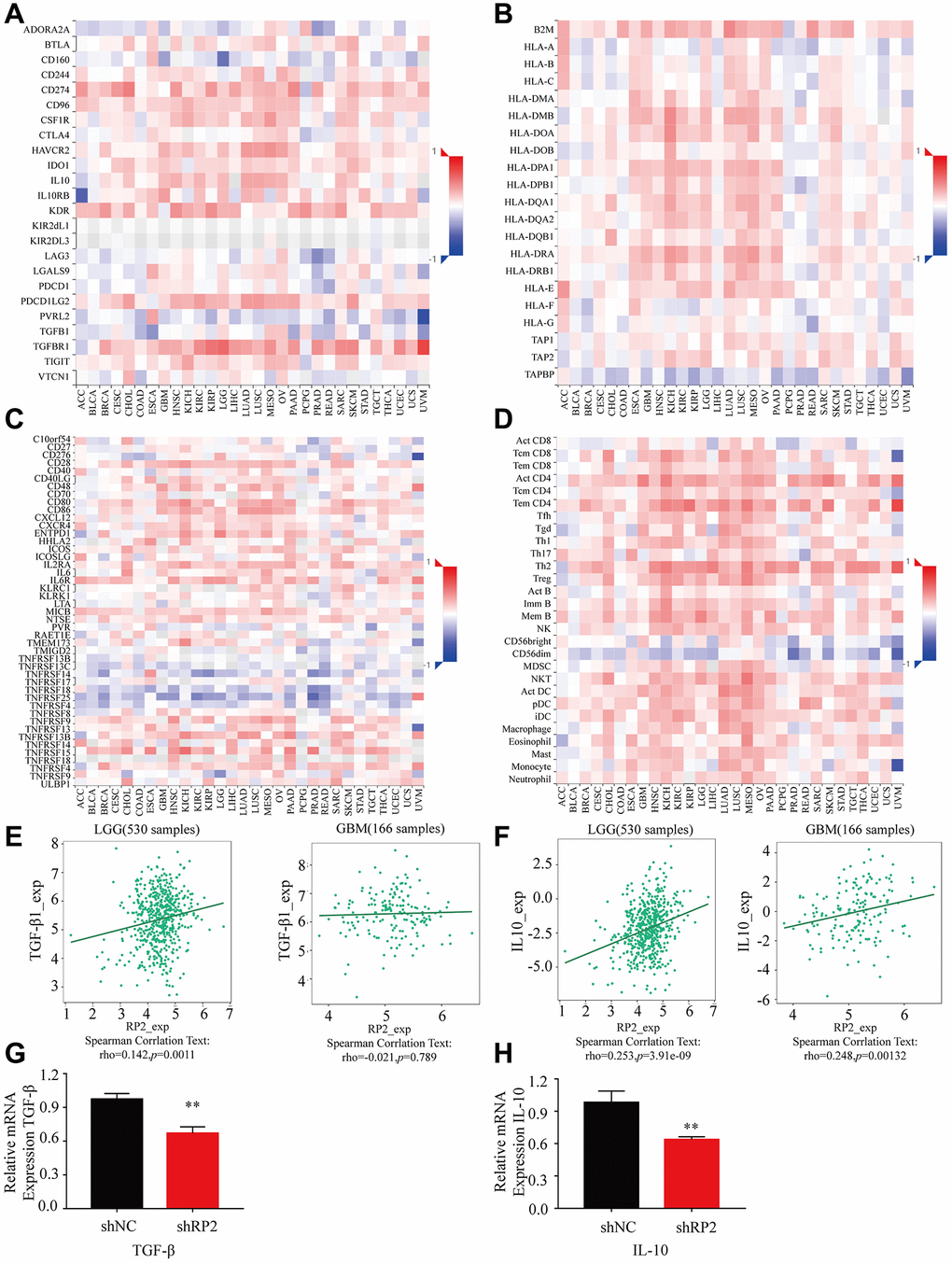 Macrophages can secrete many cytokines, which play a key role in the tumor microenvironment and development of glioma. To investigate the key effect made by various cytokines produced by macrophages in TME, we visualized the contribution of different types of it in heat map form, and the results showed that: immune inhibitor factors such as TGFBR1 and IL10; MHC molecules such as B2M and HLA-A; immunostimulatory factors such as CD28 and CD48; lymphokines such as Act CD8 and Act CD4 had a positive correlation with RP2 in both GBM and LGG (Figure 10A–10D), Noteworthily, it is conformed that Macrophages may promote the progression of glioma through secrete cytokines like IL10 and TGF-β. We analyzed the correlation between RP2 and these two (Figure 10E, 10F), and found that they were positively correlated. In addition, we also verified them with experiments (Figure 10G, 10H). In conclusion, we speculated that macrophages may cause the poor prognosis of glioma by secreting these cytokines or influenced by them.