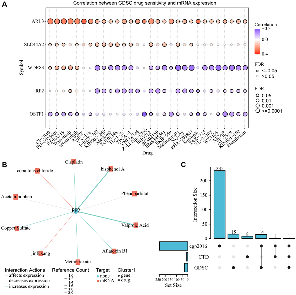 To explore the drug sensitivity of RP2 and genes highly associated with it, we conducted drug sensitivity analysis using the GDSC database, which showed that RP2 exhibited tolerance to 19 drugs or small molecules when highly expressed. And it showed sensitivity to Trametinib (Figure 12A). To explore the interaction between the pivotal gene and the available therapeutic agents for cancer, we used the CTD database to produce the interaction network between RP2 and drugs, and the results showed that cobaltous chloride and jinfukang were able to inhibit the gene expression of RP2, while six drugs or small molecules such as Methotrexate and Cisplatin were able to promote the expression of RP2 (Figure 12B). We compared three databases, cgp2016, CTD and GDSC, and concluded that Methotrexate was present in all three databases to regulate RP2 at the same time (Figure 12C). Patients are not sensitive to this drug when RP2 is highly expressed and it has been shown to increase RP2 expression, so this drug would not be the preferred option in treatment.