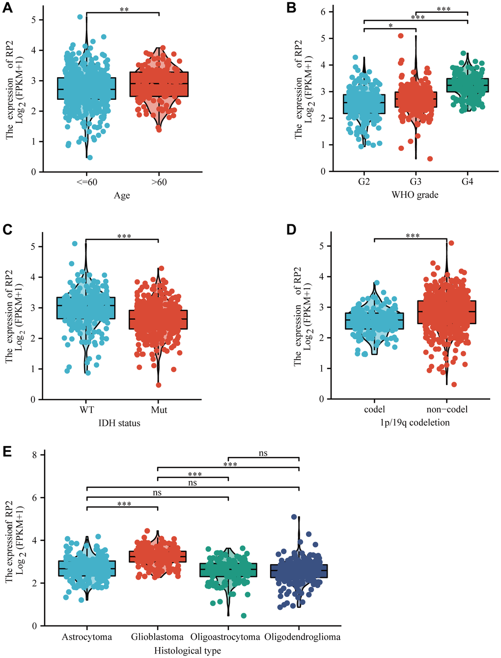 In order to determine the relevance of RP2 expression to clinicopathological characteristics, we used R software to analyse. We noticed that RP2 mRNA expression was upregulated in patients above 60, with higher tumour grade, unmutated group of IDH and in the non-coding 1P/19Q (Figure 2A–2D). Futhermore, we discovered that the mRNA expression of RP2 was most pronounced in glioblastoma among all histological types (Figure 2E). These outcomes conferred that the RP2 expression was intimately associated with the clinicopathological characteristics.