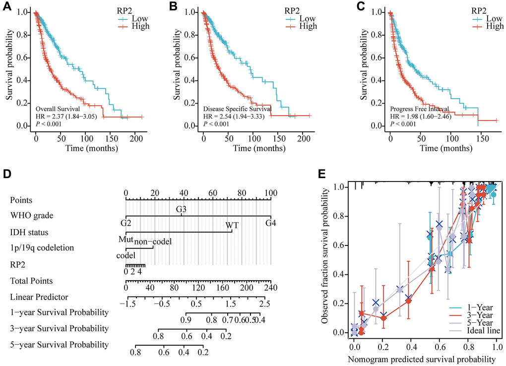 To further find the underlying mechanism of RP2 over-expression in glioma patients, we analyzed the effects of RP2 over-expression in TCGA databases on overall survival (OS), disease-free survival (DSS), and progression-free survival (PFS) of glioma patients and plotted survival curves. The findings showed that patients with high RP2 expression had proportionately lower OS, DSS, and PFS times than the low expression group, demonstrating that high RP2 expression was correlated with worse prognosis (Figure 3A–3C). Overall survival was also examined using LinkedOmics to further demonstrate the link between RP2 expression and glioma patient prognosis (Supplementary Figure 1A), and the high and low RP2 expression groups were differentiated by the GlioVis in another way, and both results indicated that the high RP2 expression group had a worse survival expectation than the low RP2 expression group (Supplementary Figure 1B–1D). Besides, in order to forecast the overall survival of glioma patients in the TCGA cohort, we developed a nomogram. The WHO grade for the malignancy, IDH status, 1p/19q codeletion, and RP2 were included in the nomogram as prognostic variables. (Figure 3D). And the calibration curve displayed that the nomogram was credible in predicting possibility of 1-, 3-, 5-years overall survival in glioma (Figure 3E). In conclusion, our data suggested that a worse prognosis for glioma patients is frequently linked to increased RP2 expression.